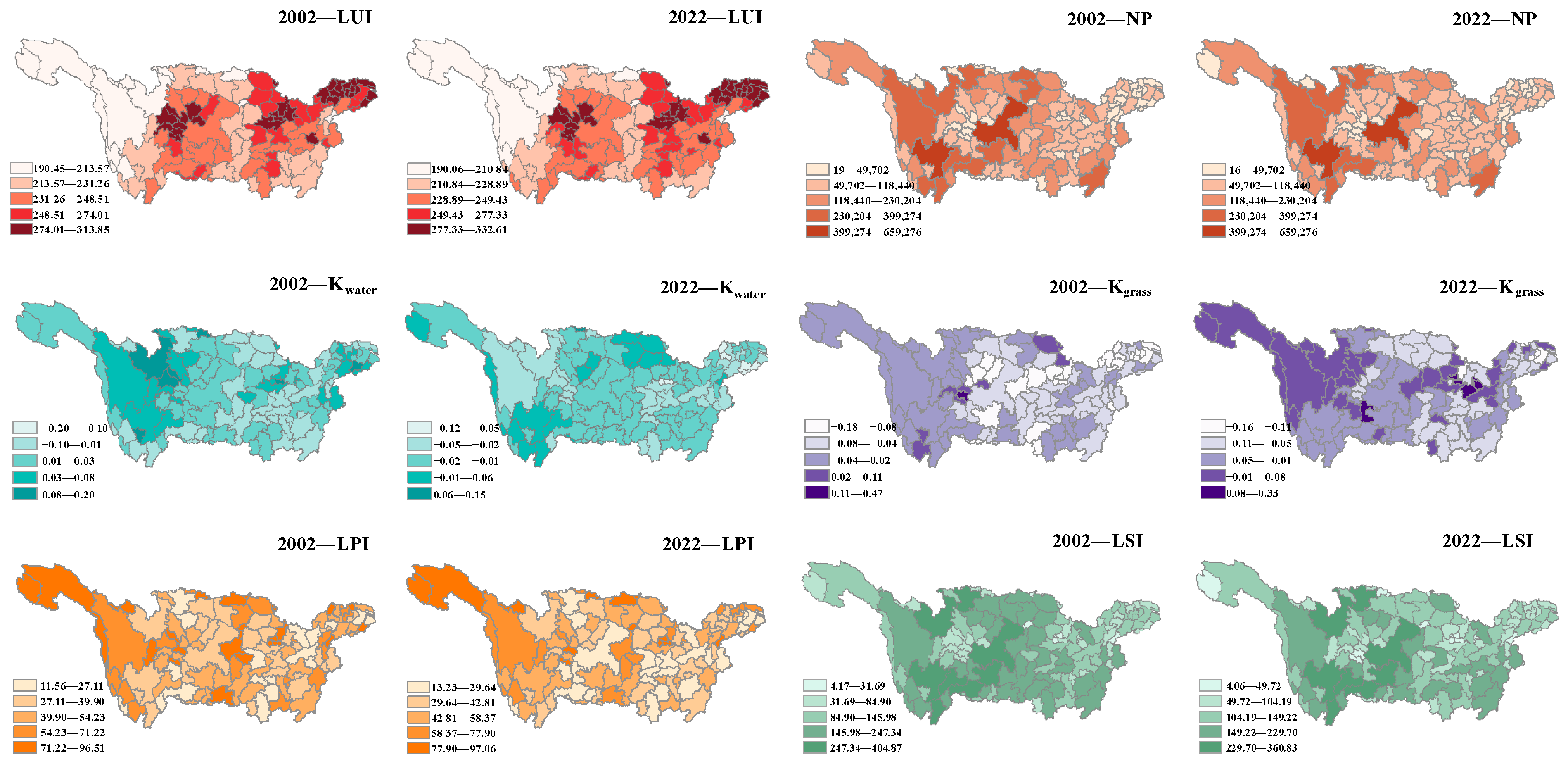 Land use data (Version 1.0.3) | 2002–2022 | The 30 m annual land cover datasets and their dynamics in China from 1985 to 2023 https://zenodo.org/records/12779975 (accessed on 1 October 2025) | 30 m × 30 m Cropland, forest, grassland, water, built-up land, unused land (six land use types) |