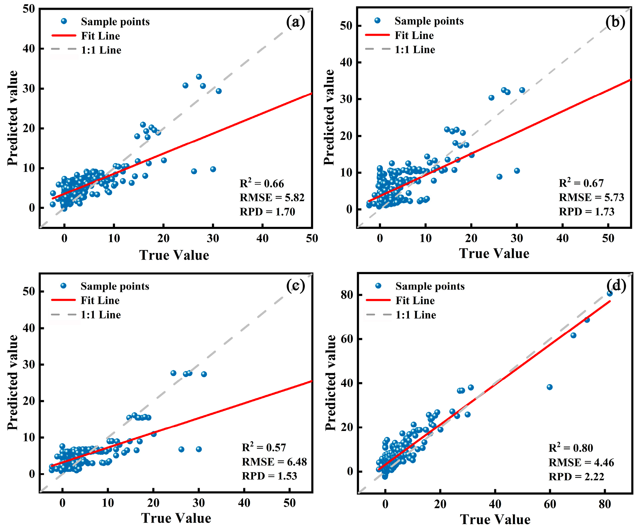 - Compared to the other three single models, the stacking ensemble model demonstrates superior predictive capability, showing strong feature extraction capabilities and significant advantages in predictive accuracy and stability. Its R2, RMSE and RPD values are 0.80, 4.46, and 2.22, respectively, which are better than the XGBoost model by 21.21%, 23.27% and 30.59%, respectively; better than the CatBoost model by 19.40%, 22.16% and 28.32%; and better than the LightGBM model by 40.35%, 31.17% and 45.10%. The stacking model effectively integrates the strengths of different learning models by combining the prediction results of multiple base learners, making full use of multisource feature information, and significantly improving the fitting and generalization capabilities of complex nonlinear relationships.