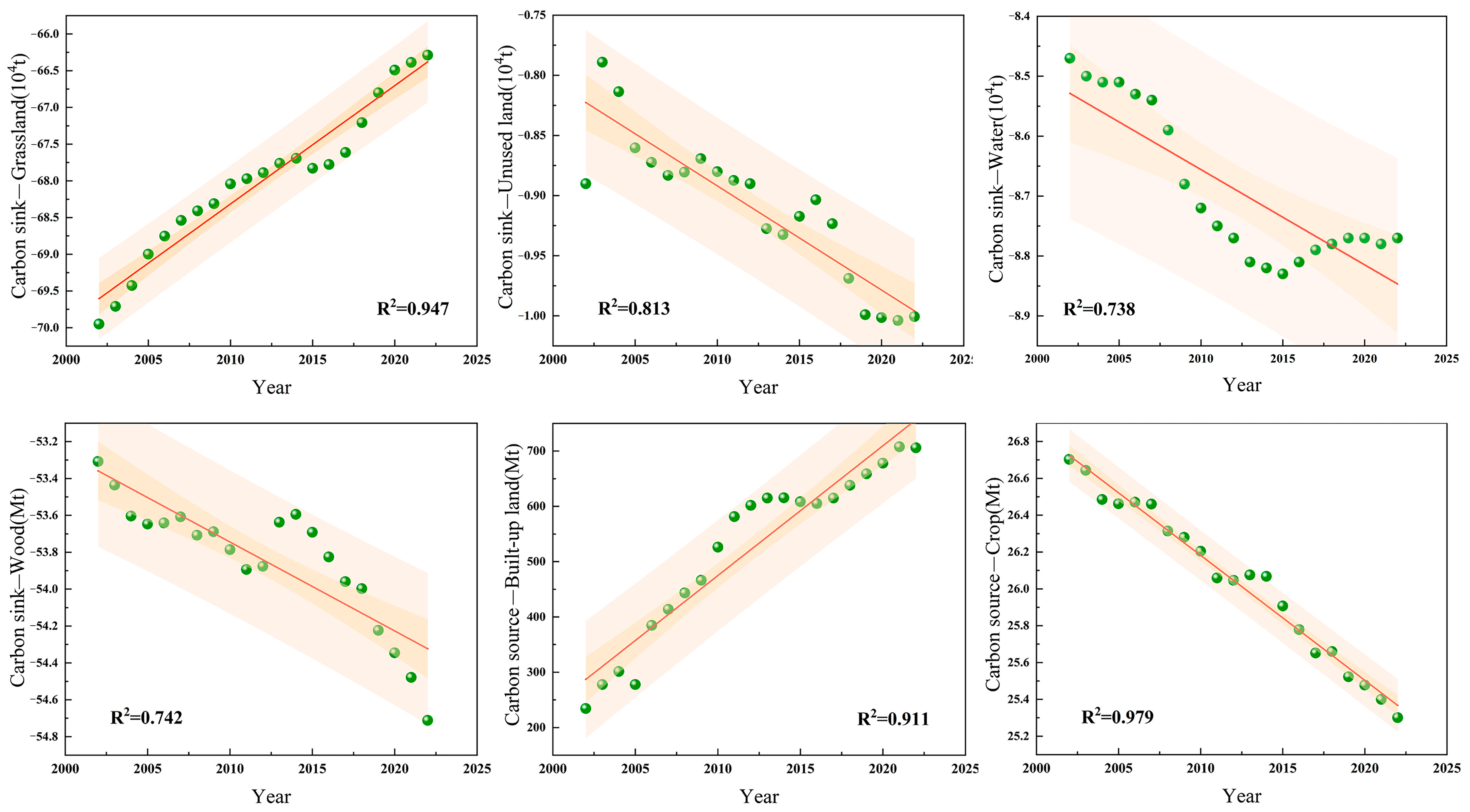 - CO2 net emissions showed a significant upward trend from 2002 to 2022, with a net increase of 468.74 Mt. The main reason for this increase was the rapid expansion of construction land, which increased by approximately 1.61 × 106 hm2, causing the proportion of carbon emissions to continue to increase. Meanwhile, carbon sources increased, while carbon sinks (grasslands and water bodies) decreased by 5.24% and 9.60%, respectively, accelerating the net increase in carbon emissions. The acceleration of urbanization and industrialization has driven land development and infrastructure construction, accompanied by the degradation of natural ecosystems and a significant weakening of carbon sink functions, thus contributing to the continuous increase in regional carbon emissions.