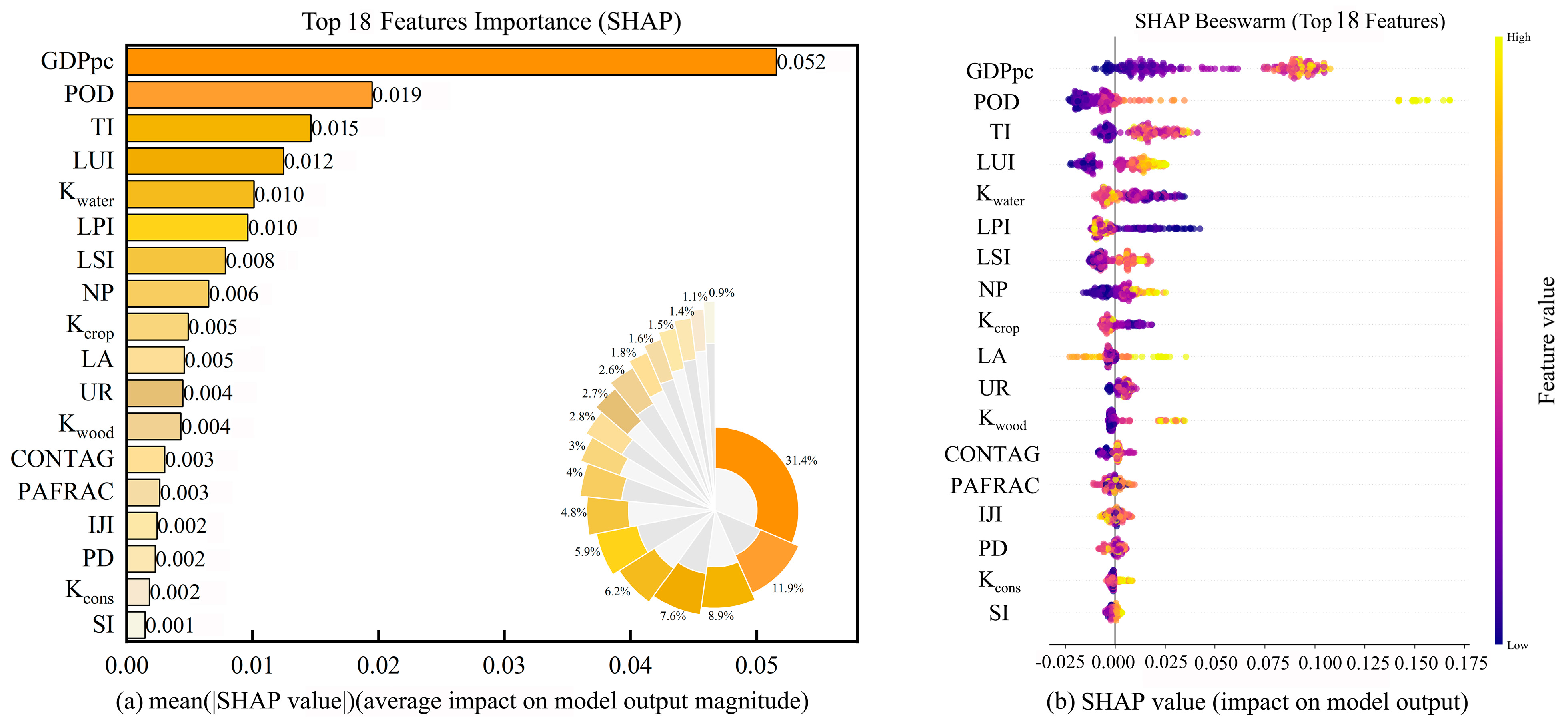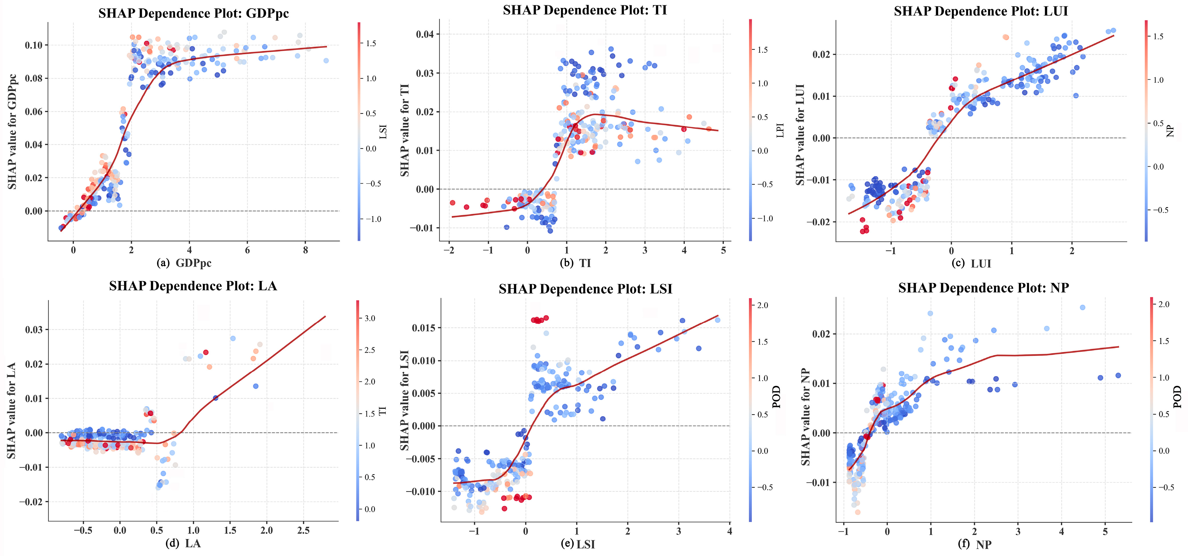 - The variable feature importance ranking in the stacking ensemble model shows that CO2 net emissions are influenced by both human factors (GDPpc, POD, and TI) and natural factors (LUI, Kwater, LPI, LSI, NP, and Kcrop). When combined with Pearson correlation analysis, CO2 net emissions were positively correlated with LUI, LUM, LA, Kwood, Kcons, GDPpc, UR, POD, TI, SI, NP, PD, LSI, IJI, and MSIDI and negatively correlated with Kcrop, Kgrass, Kwater, LPI, CONTAG, and PAFRAC. Absolute correlation coefficients are generally consistent with the importance evaluation of the characteristics. The most influential factors are GDPpc, POD, TI, LUI, Kwater, and LPI, in that order. This demonstrates that socioeconomic activities and landscape patterns influence carbon emissions through multidimensional pathways, and factors including population density, economic level, and land use intensity significantly regulate the spatial distribution and dynamic changes in regional carbon emissions by altering energy consumption structures and ecosystem functions.