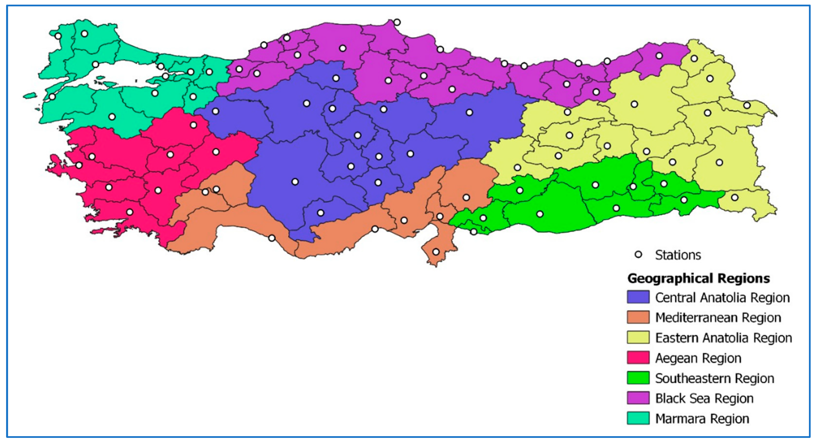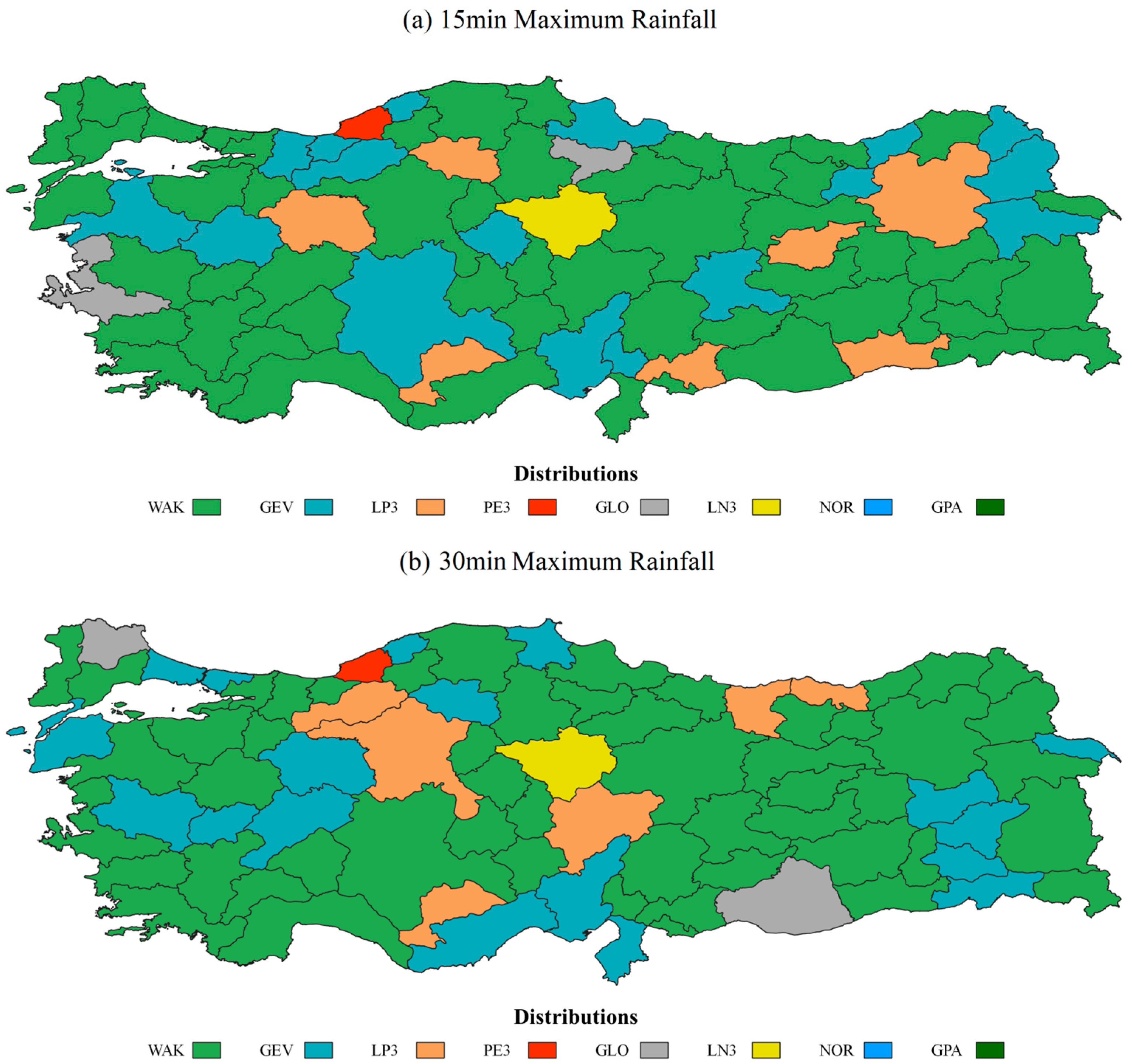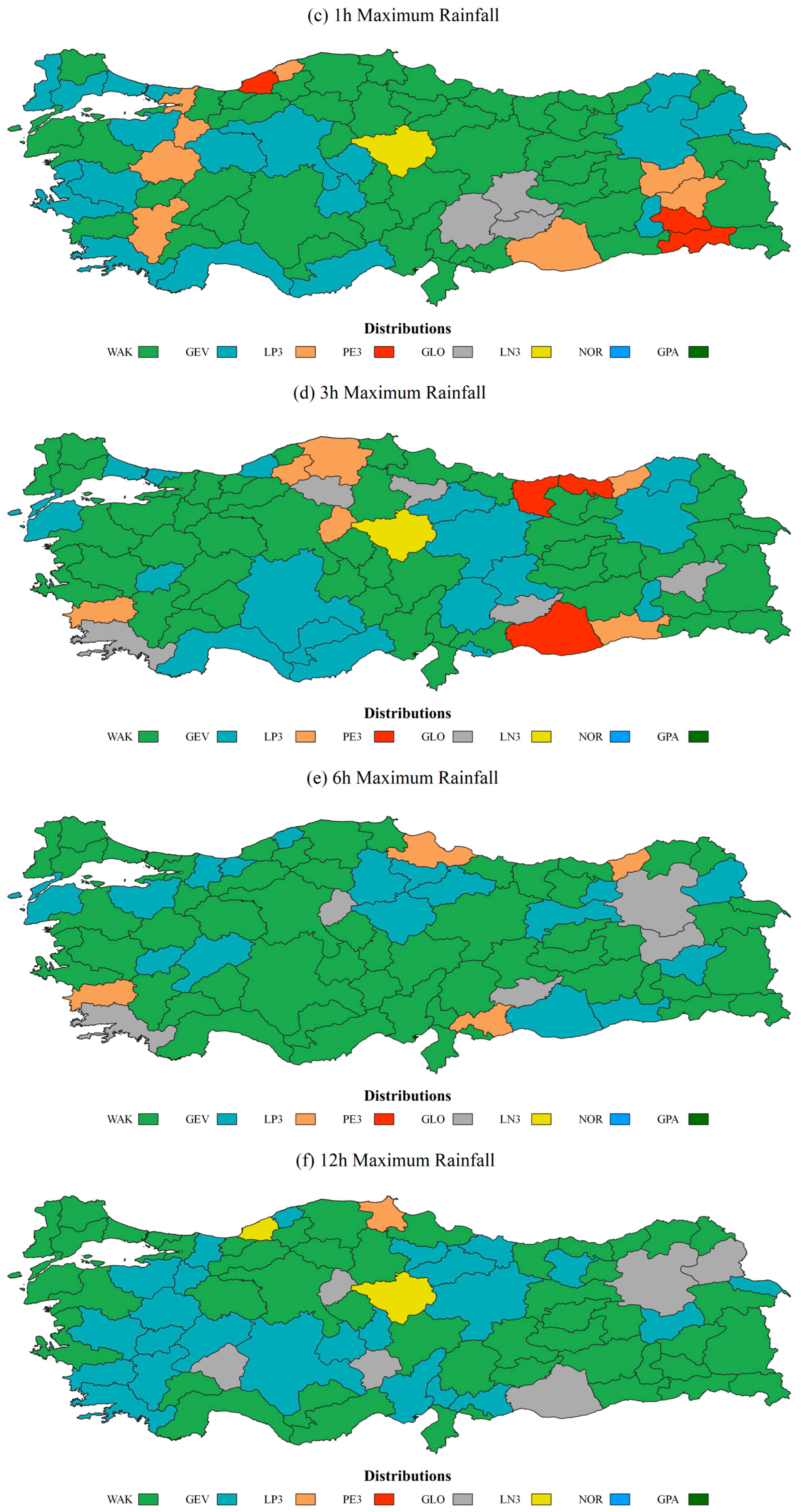APA StyleTemel, I., Asikoglu, O. L., & Alp, H. (2025). Examining the Probabilistic Characteristics of Maximum Rainfall in Türkiye. Atmosphere, 16(10), 1177. https://doi.org/10.3390/atmos16101177