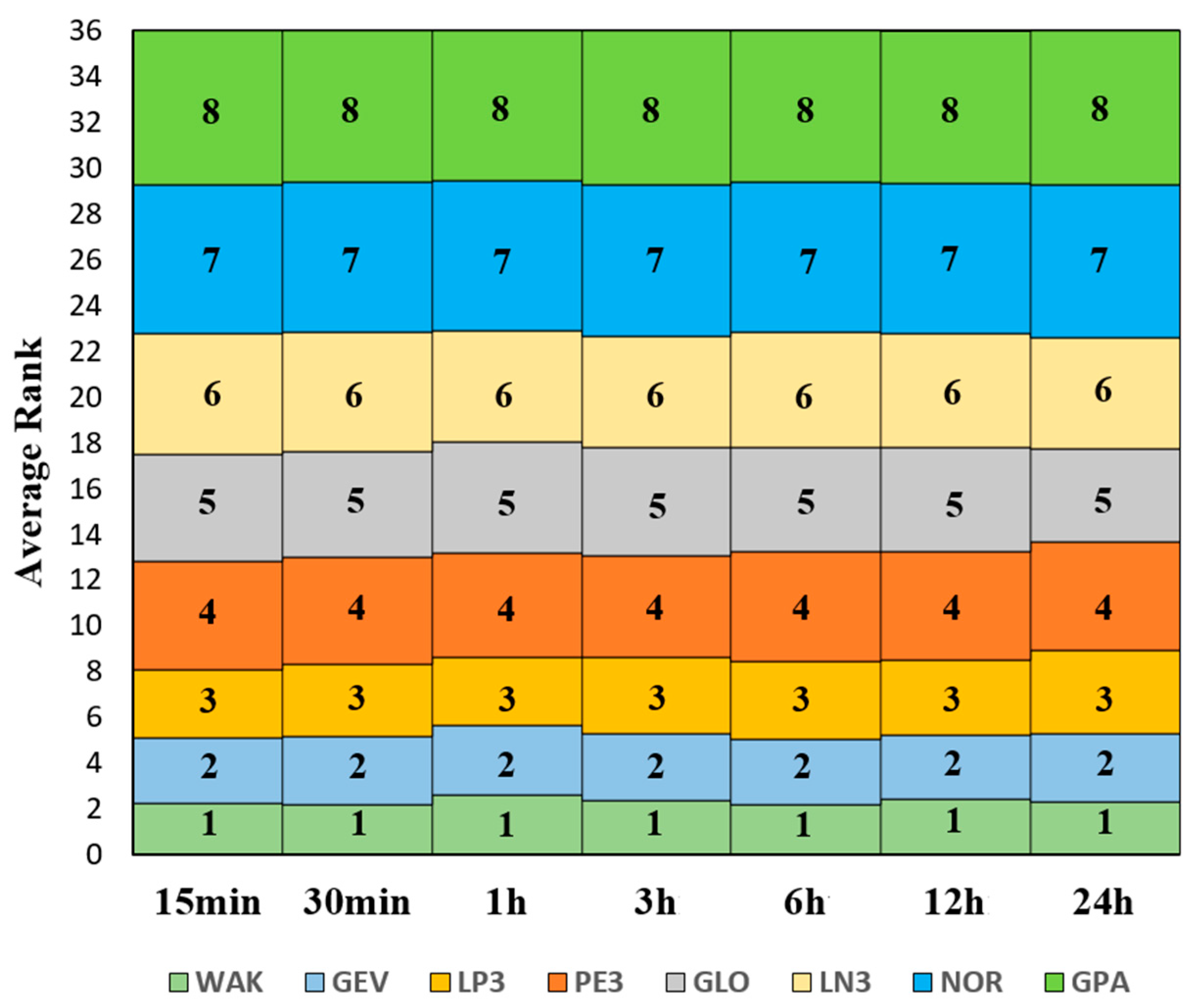 3.1. Best Fit Probability Distributions for Each Rainfall Durations