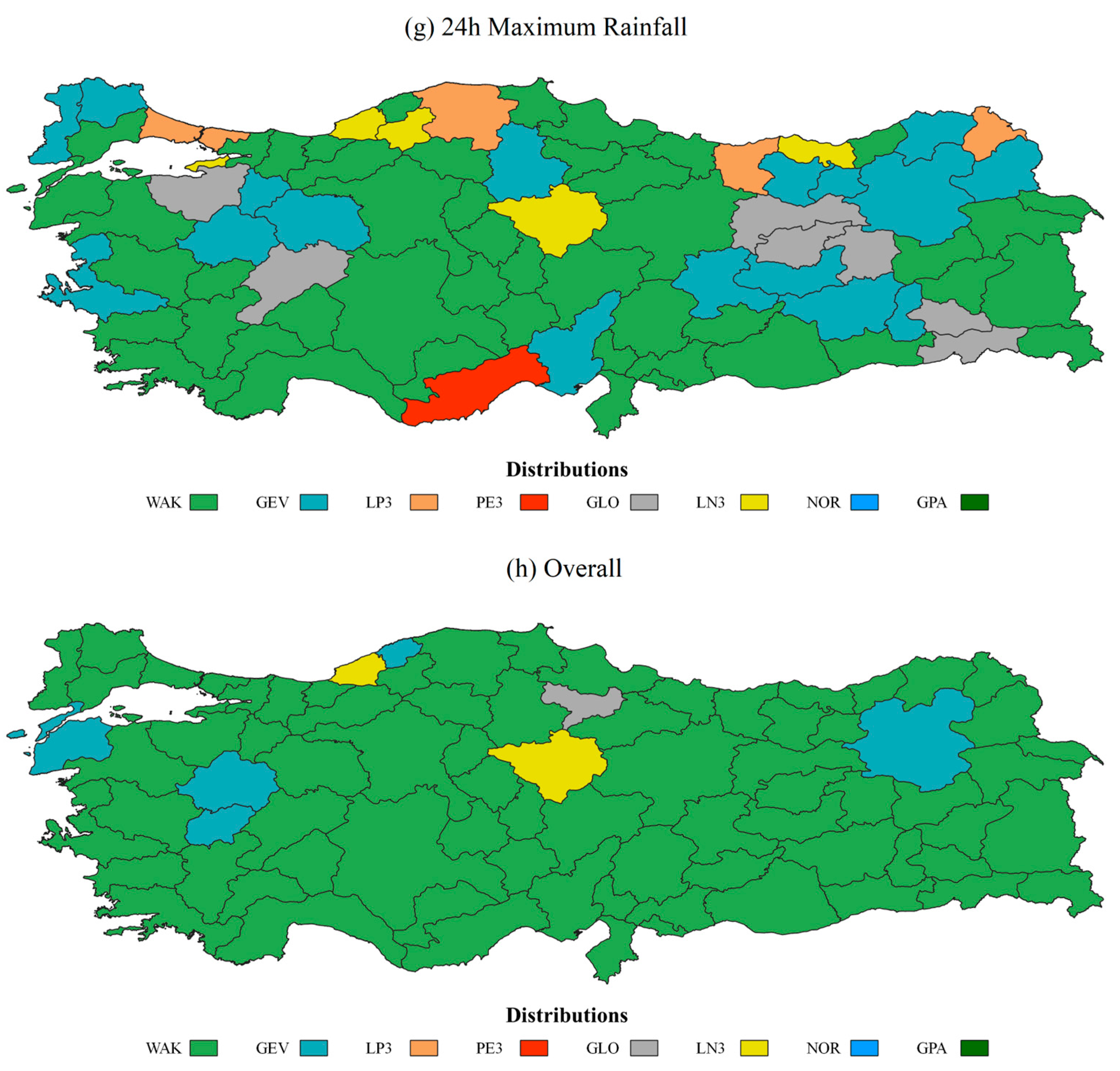 [37] | sub-daily and daily max. | Aegean region—Türkiye | KS, AD, χ2 | GAM, LN2, GEV |