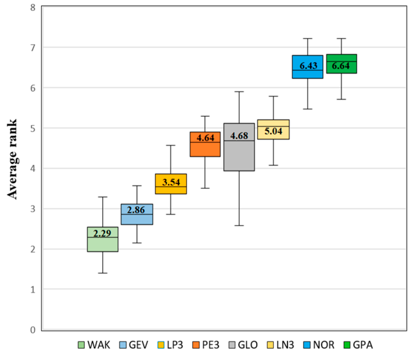 3.4. Best Fit Probability Distributions According to Goodness of Fit Tests