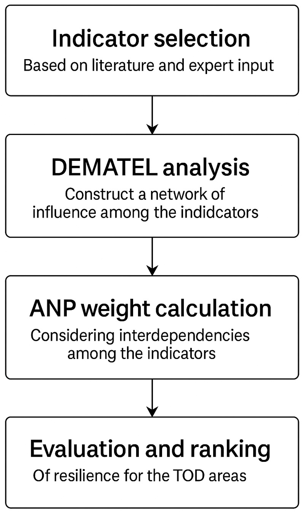 To address these questions, this study uses a multi-criteria analytic approach. We employ the Dynamic Analytic Network Process (DANP), which combines DEMATEL (Decision-Making Trial and Evaluation Laboratory) and ANP (Analytic Network Process) methods, to evaluate a network of interrelated resilience factors in TOD areas. This allows us to incorporate the complex interdependencies among factors like land use, transportation, infrastructure, environment, and socio-demographics, rather than treating them in isolation. The DANP has been applied in urban resilience assessments to identify causal relationships and weight factors [