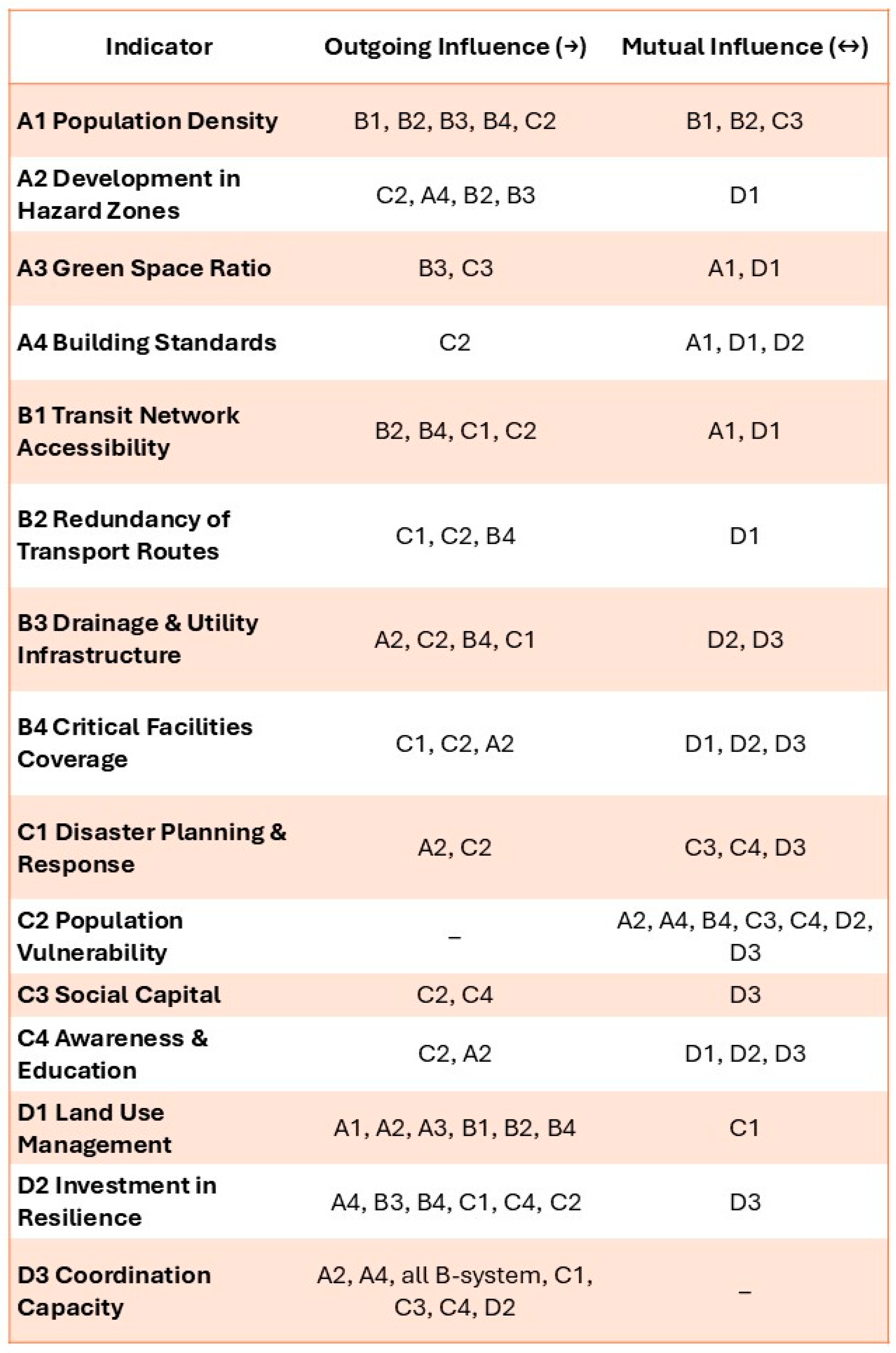 The DEMATEL analysis also revealed reciprocal relationships. For example, B3 (drainage infrastructure) and D2 (governance investment) showed a feedback loop: investment strengthens infrastructure, while infrastructure failures in turn prompt additional investment. Similarly, C1 (emergency planning) and C3 (social capital) demonstrated a two-way relationship: a prepared community increases the effectiveness of plans, while well-designed plans enhance community confidence and participation.