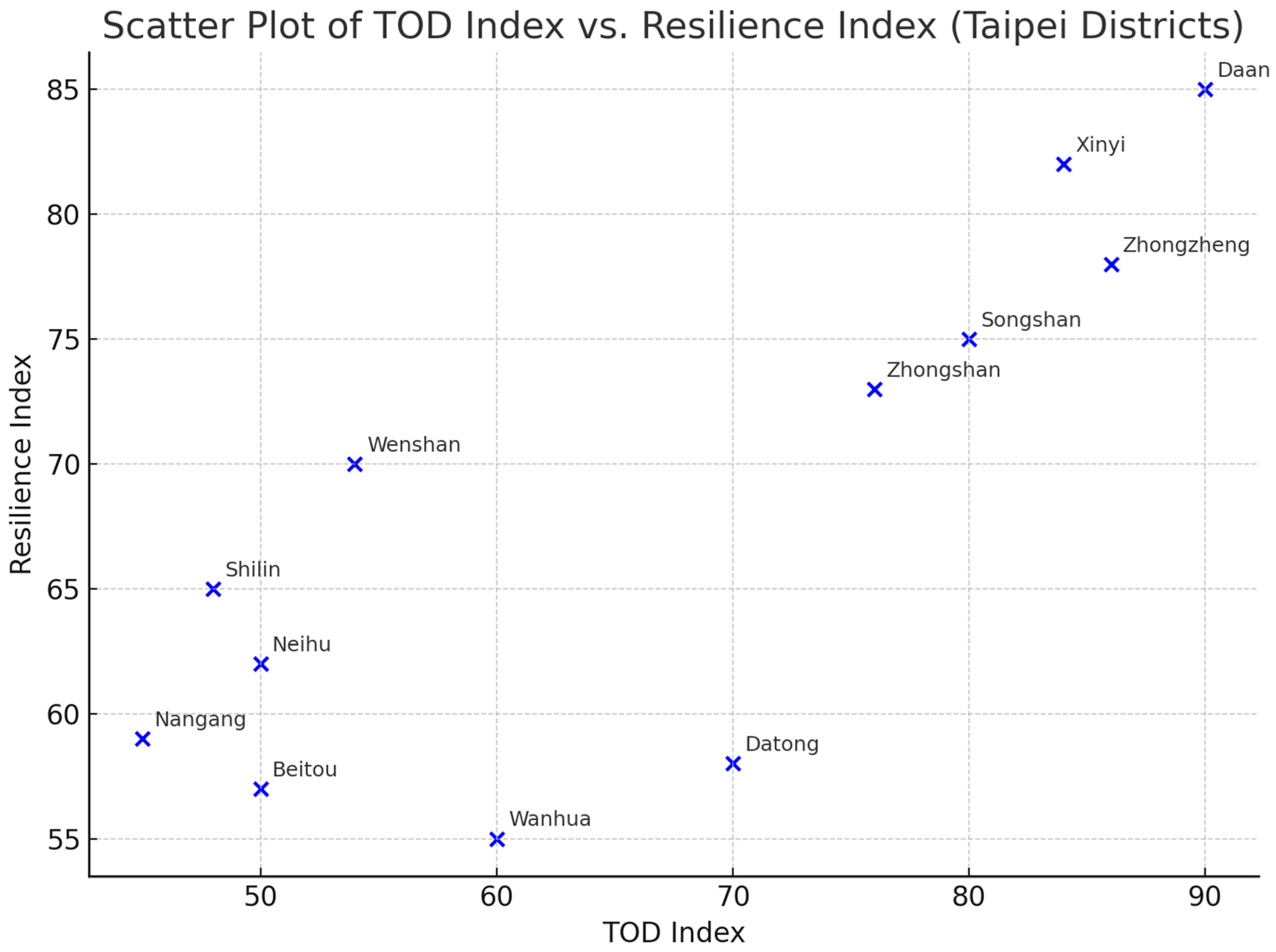 Using the DANP weights and the district-level data for each criterion, we computed a Resilience Index for each district of Taipei. The index is a weighted sum of normalized criterion scores (with higher values indicating more resilience). Similarly, we created a simple TOD Index (based on population density, station density, and mixed-use, with equal weighting among those). The purpose is to see how districts rank in resilience and whether those ranks correlate with their TOD characteristics.