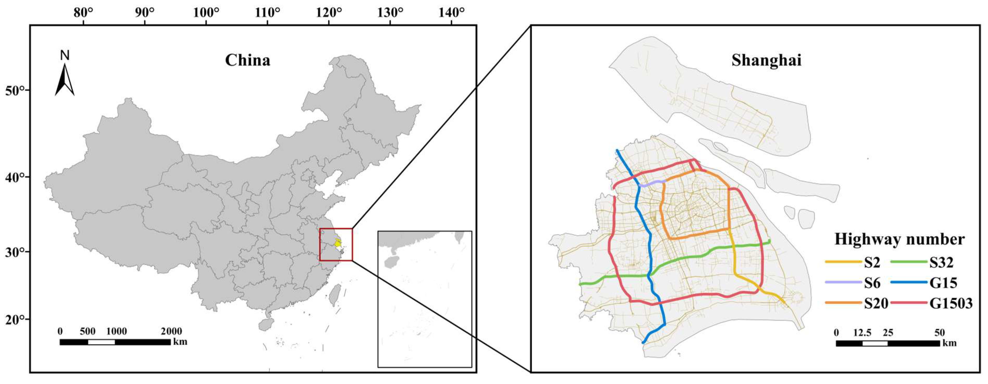 7]. Shanghai, one of the world’s leading container port cities, maintains a comprehensive and well-developed road network to support freight collection and distribution. The city experiences high volumes of large truck traffic and intense vehicle operation, both of which significantly impact local air quality. In response, the Shanghai Clean Air Action Plan (2023–2025) mandates the implementation of the China VI b emission standard beginning in July 2023, calls for the complete phase-out of China III-compliant diesel trucks by the end of 2025, and explores accelerated retirement of China IV vehicles [