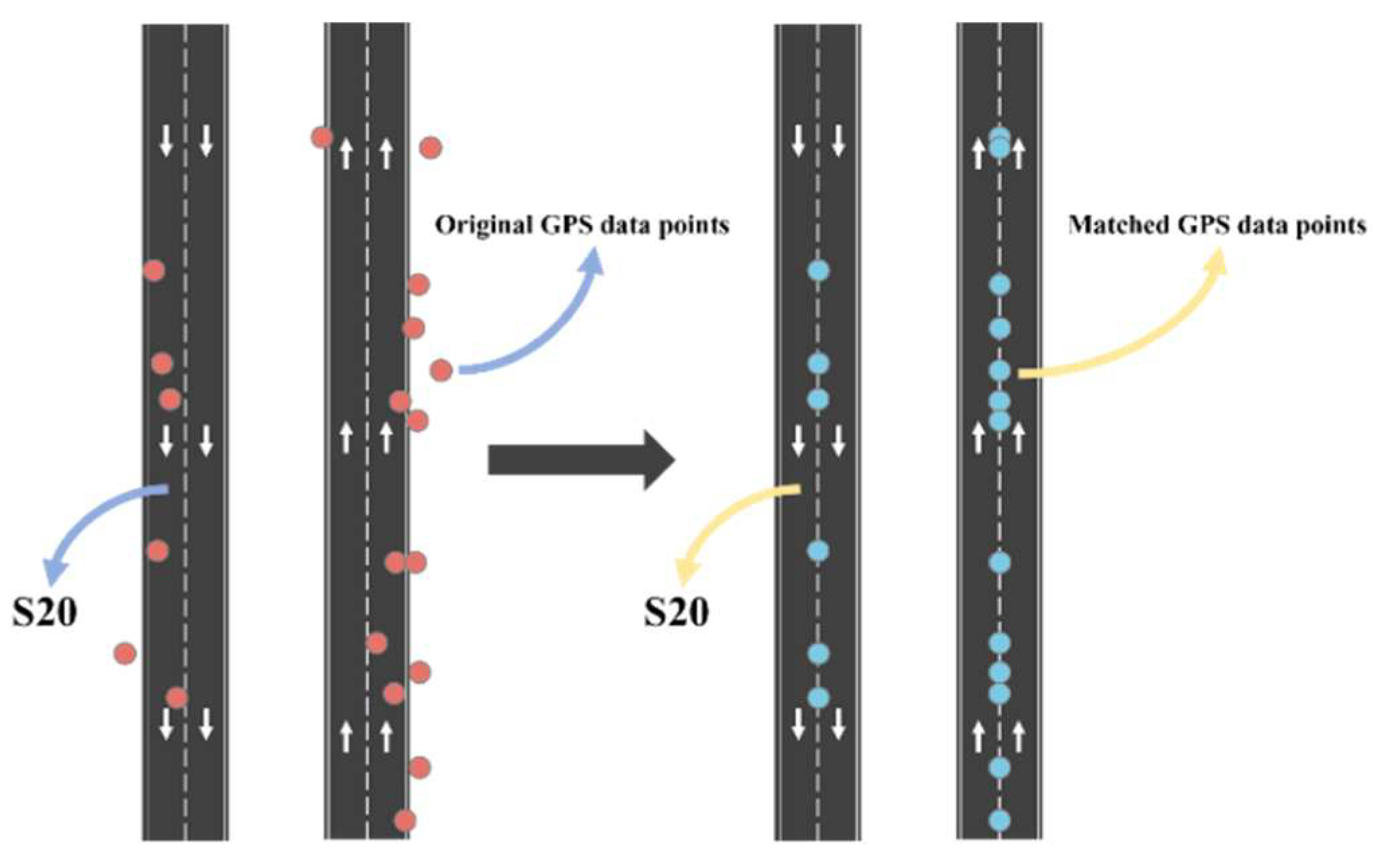 17]. The widespread adoption of GPS technology has enabled the collection of vehicle trajectory data with high temporal continuity and broad spatial coverage. GPS data are characterized by large sample sizes and multidimensional attributes, capturing key operational parameters such as speed, acceleration, travel distance, and idling status. These parameters are critical for accurately identifying vehicle operating modes and corresponding emission processes [