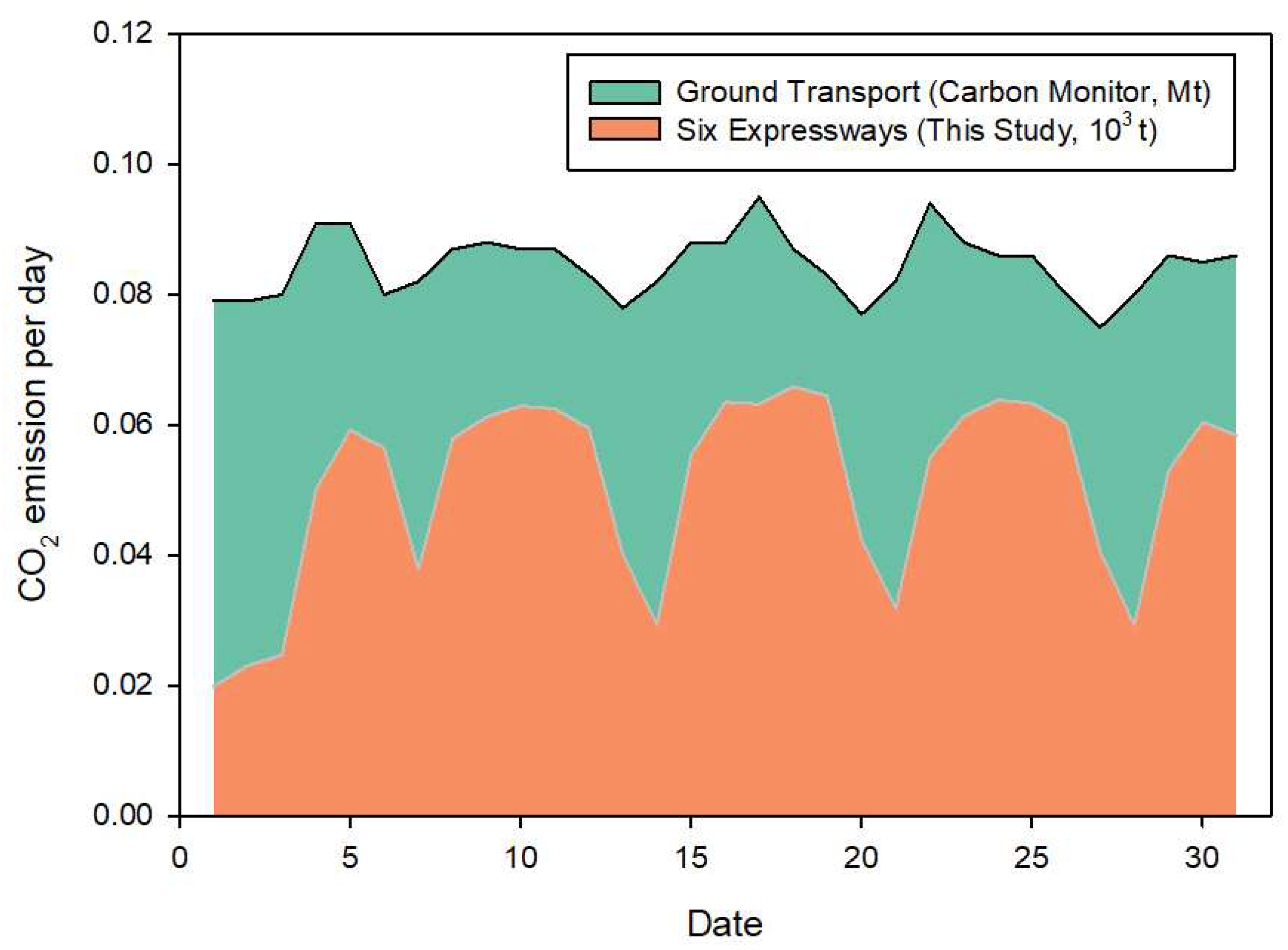 2 emissions from Shanghai’s ground transport (Carbon Monitor) and from six expressways (this study). The two curves exhibit a generally consistent variation pattern over the analysis period, both showing coincident peaks and troughs, suggesting that the model-based estimates effectively capture the real-world dynamics of transportation-related emissions despite the difference in absolute magnitude. This indirect comparison provides additional evidence supporting the robustness and reliability of the emission estimation results.