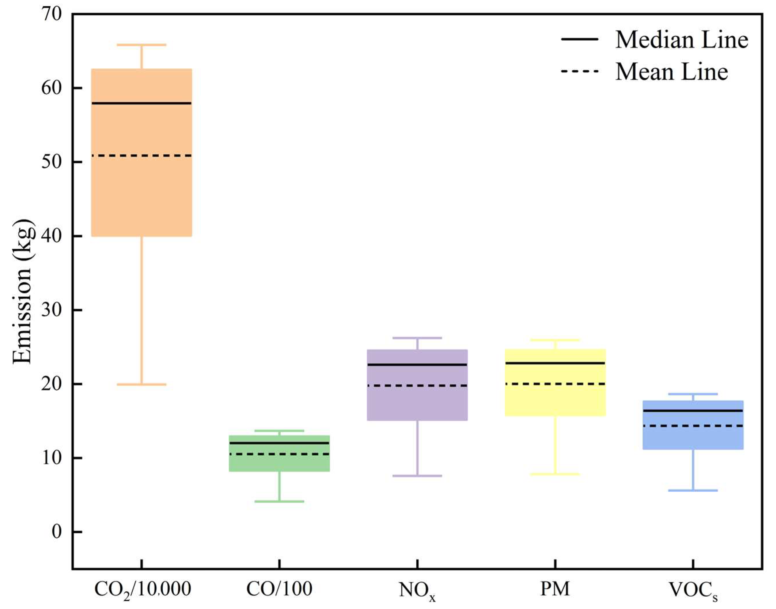 x), particulate matter (PM), and volatile organic compounds (VOCs) were 32,686.16 kg, 61,317.61 kg, 620.96 kg, and 444.99 kg, respectively. Among these, CO