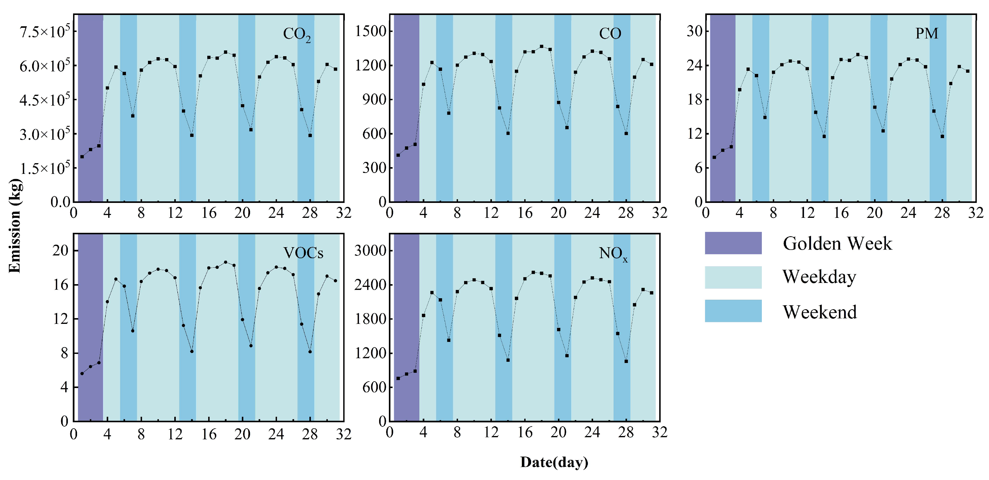 The results demonstrate similar temporal trends across the five pollutants—CO2, CO, PM, VOCs, and NOx—characterized by the subsequent features: (1) Emissions during Golden Week were significantly lower compared to those recorded in other periods. This reduction reflects decreased HDDT activity during the holiday period, as inferred from GPS trajectory data. (2) Weekday emissions were generally higher than weekend levels, with peaks typically occurring from Tuesday to Thursday, forming a mid-week hump-shaped pattern. These mid-week peaks may be related to port logistics scheduling and freight demand, although direct traffic volume and operational data were not available to quantify this effect. (3) Weekend emissions were consistently lower on Sundays compared to Saturdays. Apart from the first weekend, emissions remained relatively stable across subsequent weekends.