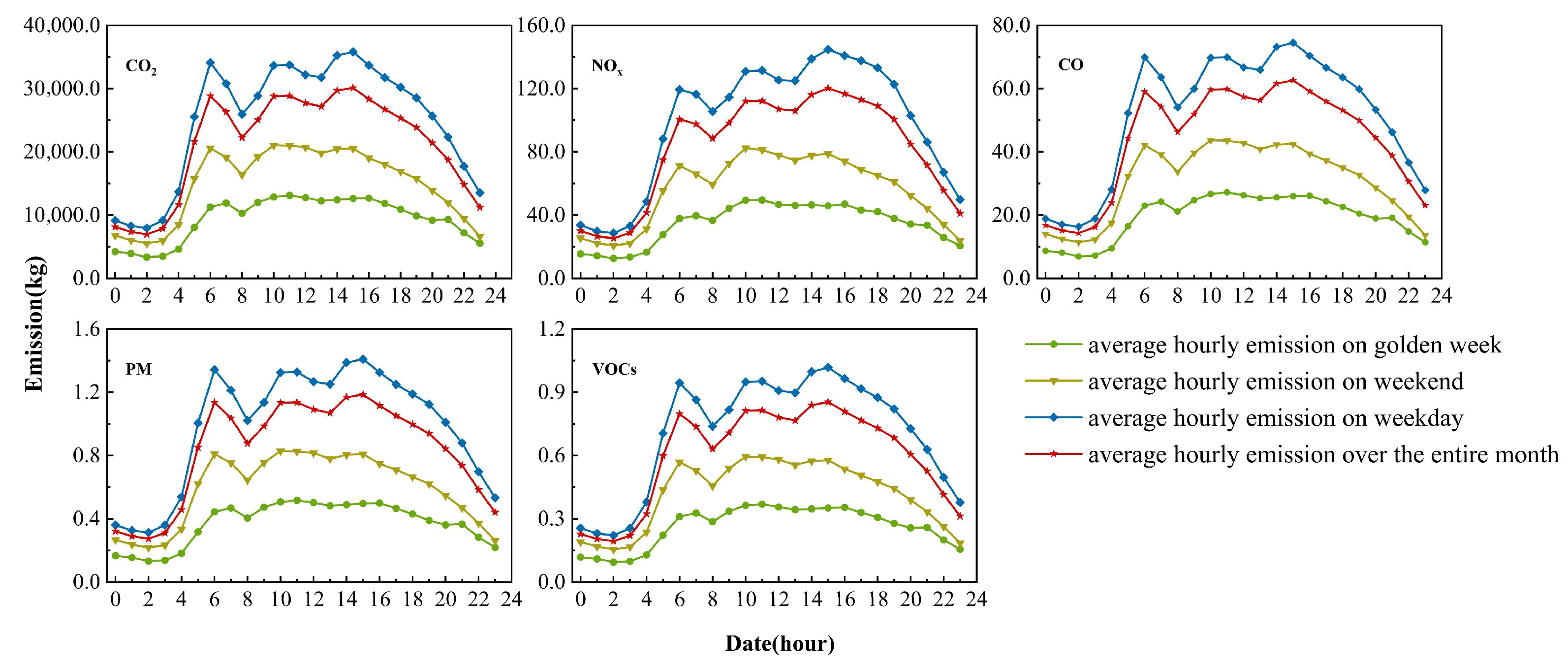 (1) There are marked differences in both the total volume and composition of emissions. CO2 accounts for the largest share, followed by NOx and CO, while VOCs and PM contribute relatively smaller amounts. Notably, daytime emissions of NOx and CO show significant fluctuations, indicating high sensitivity to traffic flow variations. In contrast, CO2, PM, and VOCs display more stable temporal emission patterns. To mitigate peak-time emissions, logistics schedules can be optimized through nighttime freight operations and staggered transport arrangements, thereby easing congestion and reducing pollution.