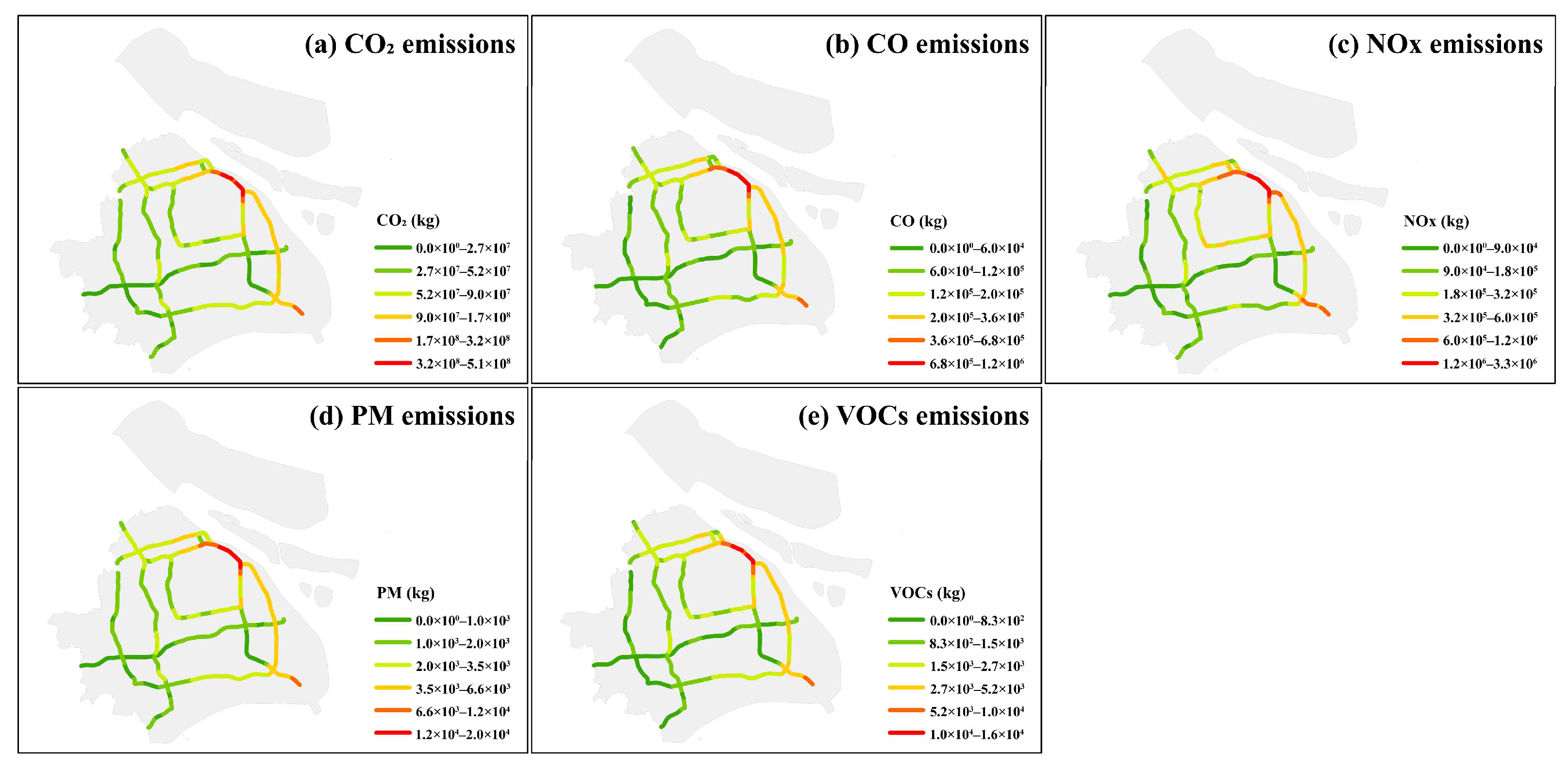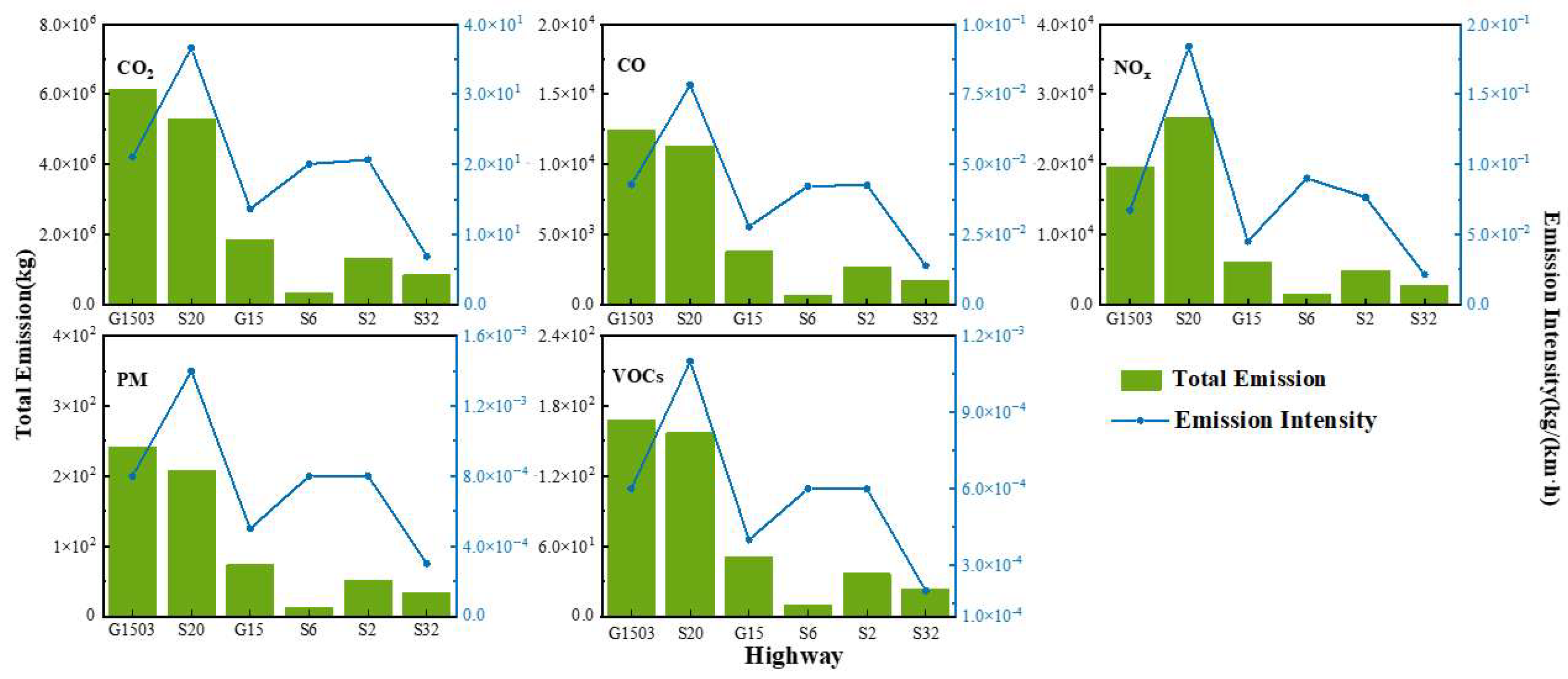 Especially in the northeastern area where S20 intersects with G1503, the emission intensity in this region is significantly higher than in other sections due to the single channel for incoming and outgoing port traffic and frequent transfers. The emission intensity per unit length of S20 is about five times that of S32, while G1503, despite having the highest total emissions, has its unit intensity diluted by its longer road segments. This contrast between total emissions and unit intensity reveals the combined effect of freight traffic density and road geometric characteristics on emission distribution. These findings suggest that targeted mitigation strategies—such as traffic rerouting, optimization of port dispatch schedules, or speed regulation—could effectively reduce high-intensity emissions on shorter segments like S20 while also lowering overall emissions on longer corridors such as G1503. Quantifying both total emissions and emission intensity thus provides a clear basis for prioritizing interventions along critical freight corridors in Shanghai.