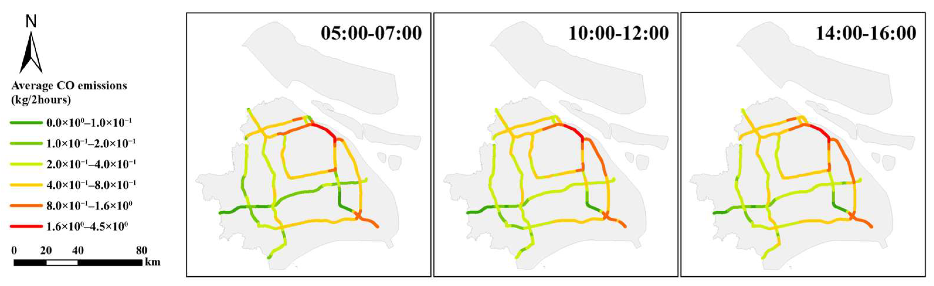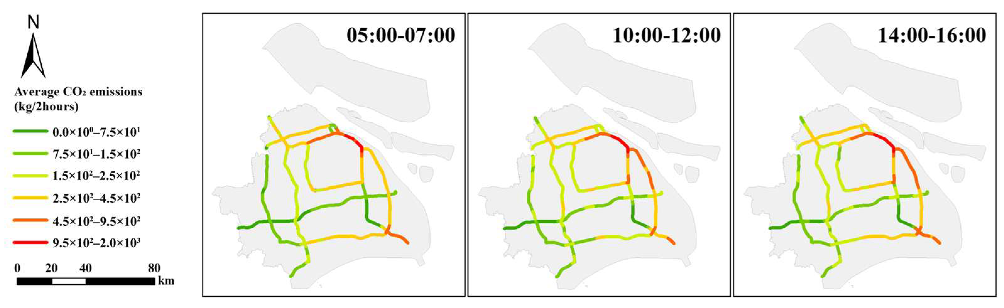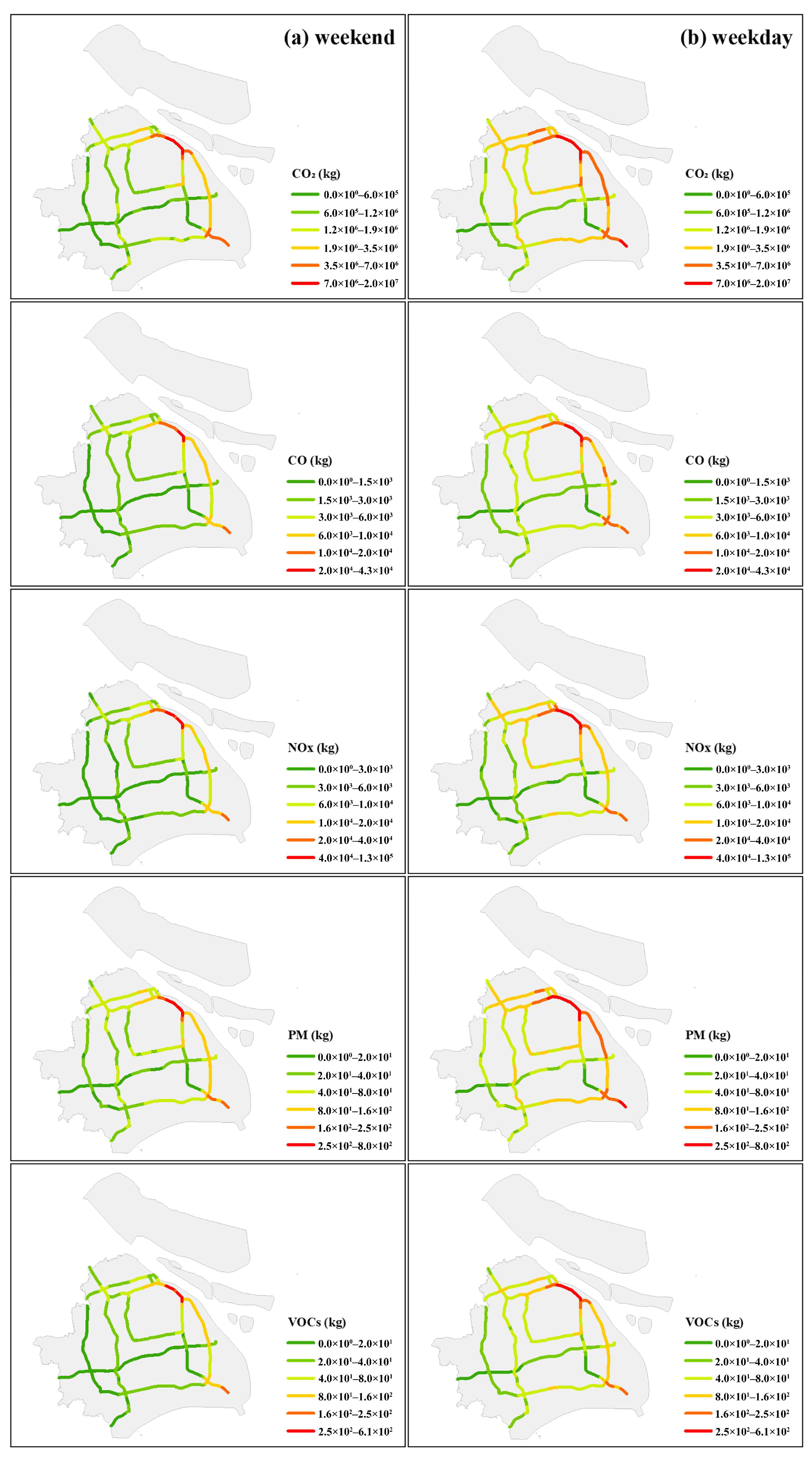 2 and CO emission hotspots exhibit noticeable temporal migration during the three peak periods, with outbound transportation dominating in the early morning and return trips intensifying in the afternoon. On weekends, due to reduced freight demand, high-emission segments are shorter, and their emission intensity decreases. It worth notes that the spatiotemporal distribution patterns of CO