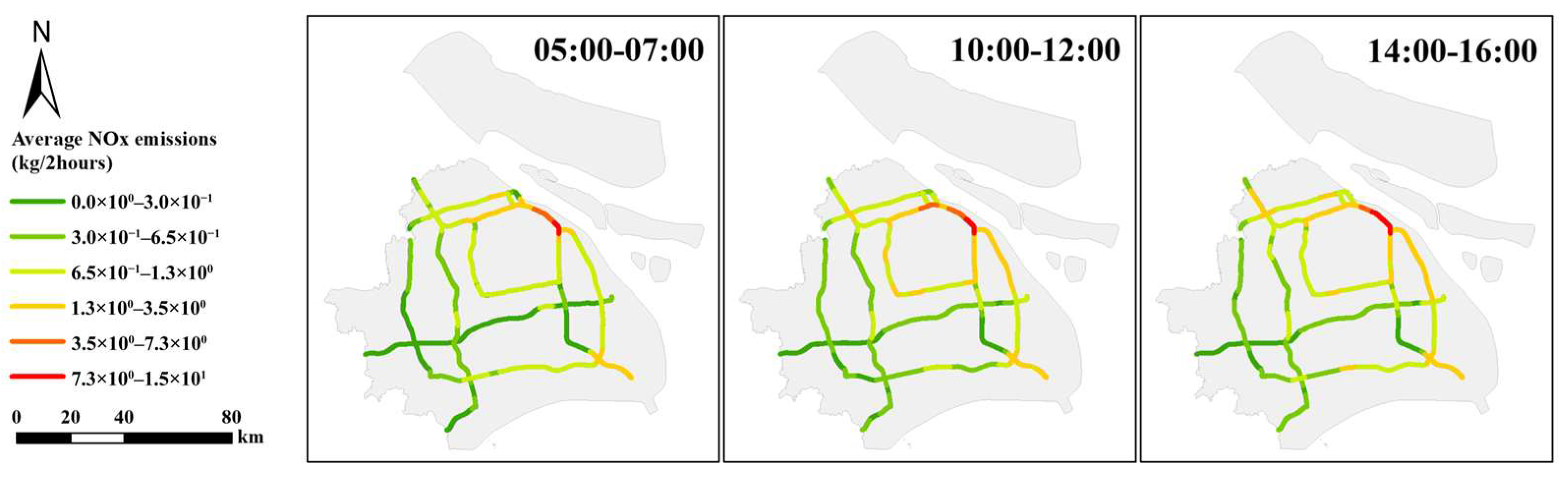 x emissions from container trucks to serve as a benchmark for model estimation. Based on these comparisons and in combination with the localization of key parameters, our estimation using COPERT V is expected to have an uncertainty range of ±10–20%. Therefore, although some uncertainty remains due to the absence of direct calibration, the estimated emissions can still be regarded as representative of the overall spatiotemporal patterns of HDDT-related emissions in Shanghai. Future work will focus on integrating local on-road emission data to refine model parameters and further improve estimation accuracy.