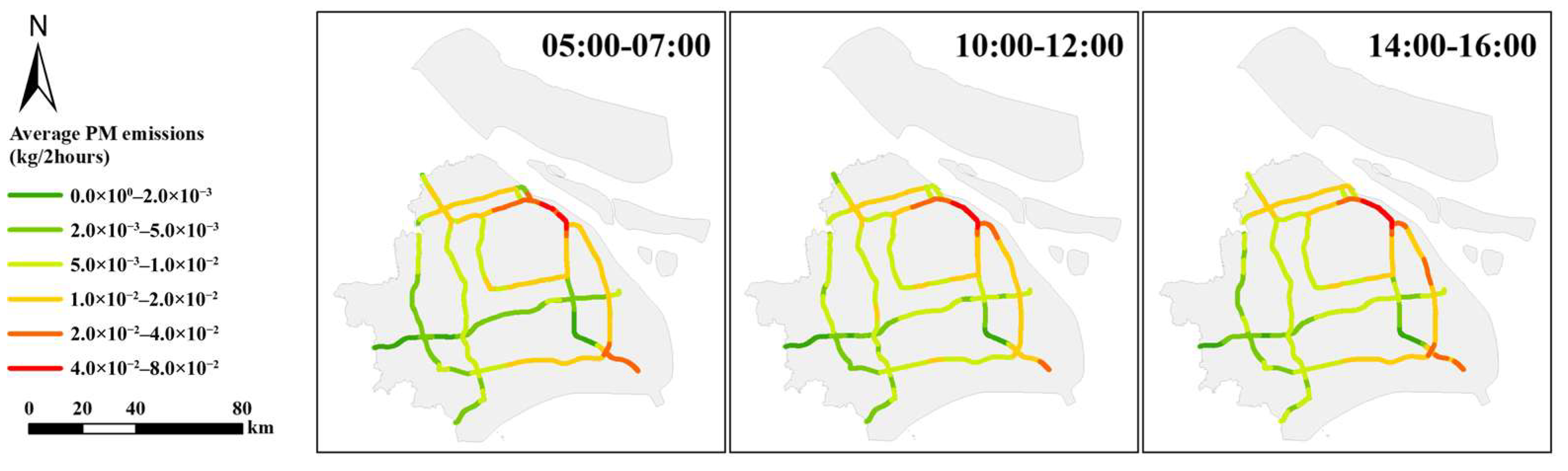 Figure 5. Although the absolute magnitudes of PM concentrations and modeled emissions differ, the overall temporal trends exhibit consistent patterns, with peaks and troughs occurring on similar days. This qualitative agreement provides supportive evidence that the emission estimates derived in this study reasonably capture the spatiotemporal variations in particulate matter emissions from freight trucks in Shanghai.