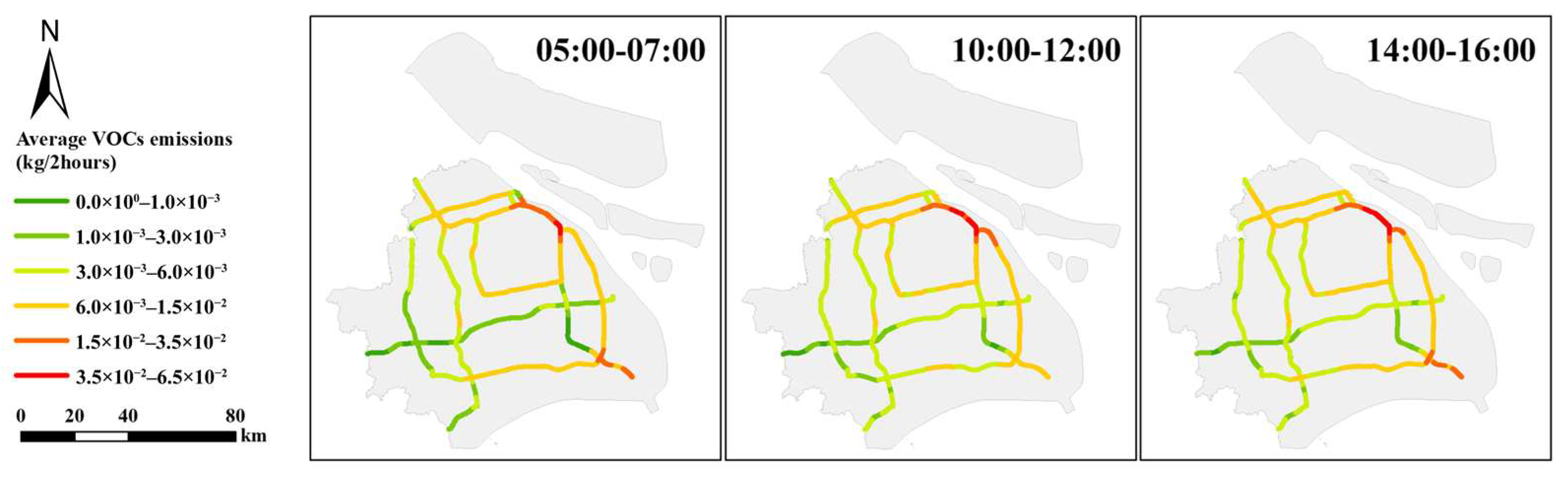 x emissions remain relatively stable, consistently concentrated in the northeastern segment of the S20 expressway throughout all three peak periods, showing limited spatial variability over time. PM and VOC emissions exhibit more pronounced temporal fluctuations. Their high-emission zones during the three time periods are mainly concentrated along the northeastern section of S20, the eastern section of G1503, and the southeastern portion of S2. Notably, during the 10:00–12:00 period, emissions in the southeastern segment of S2 decline slightly, followed by a marked rebound from 14:00 to 16:00, likely reflecting increased return freight traffic in the afternoon.