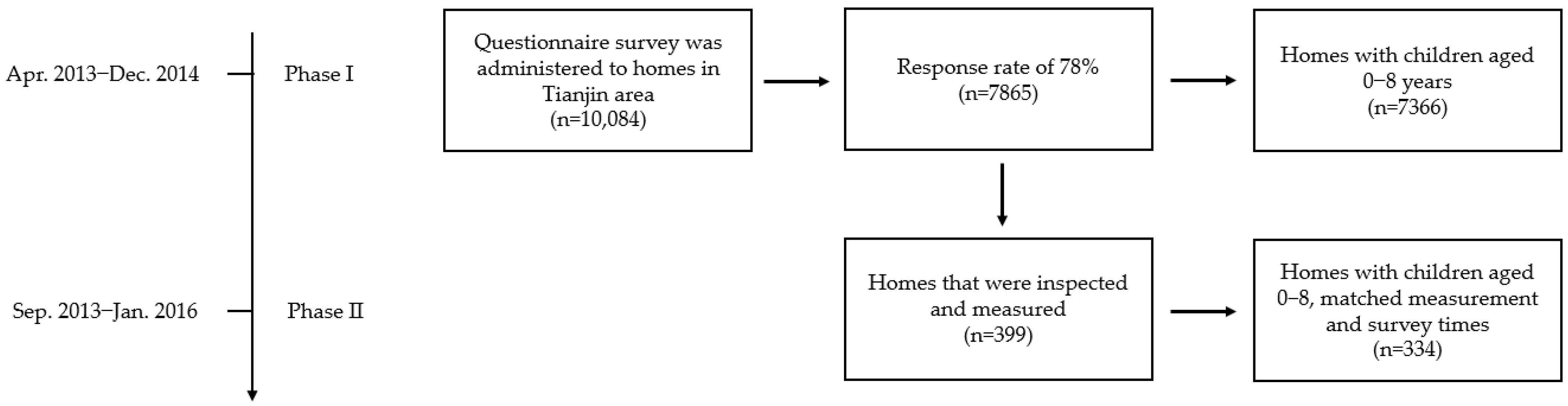 Figure 1). In the first phase (1 April 2013–31 December 2014), questionnaires were administered to 10084 families with children aged 0–8 years old in the Tianjin area. One parent per family was invited to answer the survey. In the second phase (1 September 2013–31 January 2016), 399 families participated in home inspections and measurements. Since February 2016, the data has been accessed for research purposes. However, the authors had no access to information that could identify individual participants.