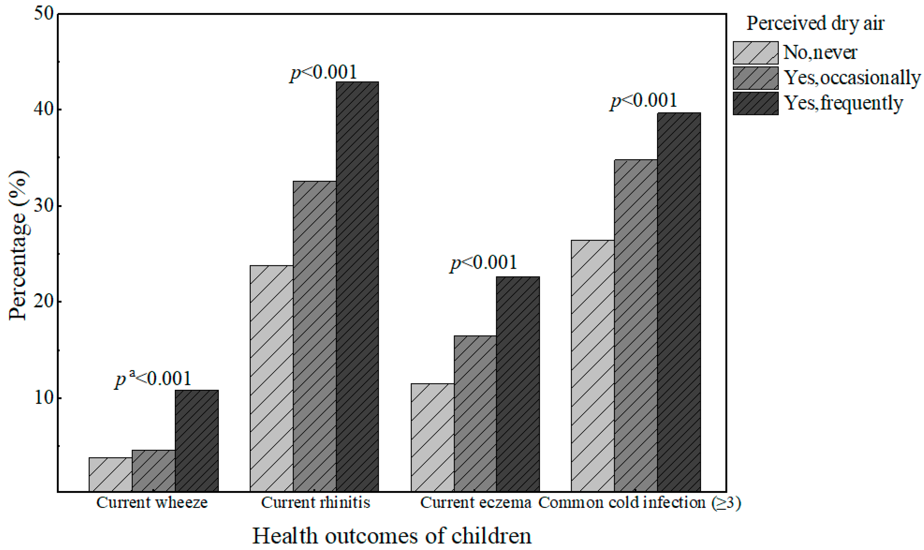 p < 0.05). Perceived dry air was significantly associated with wheeze, rhinitis, eczema, and common cold among the children, and the associations were stronger for frequently perceived dry air (