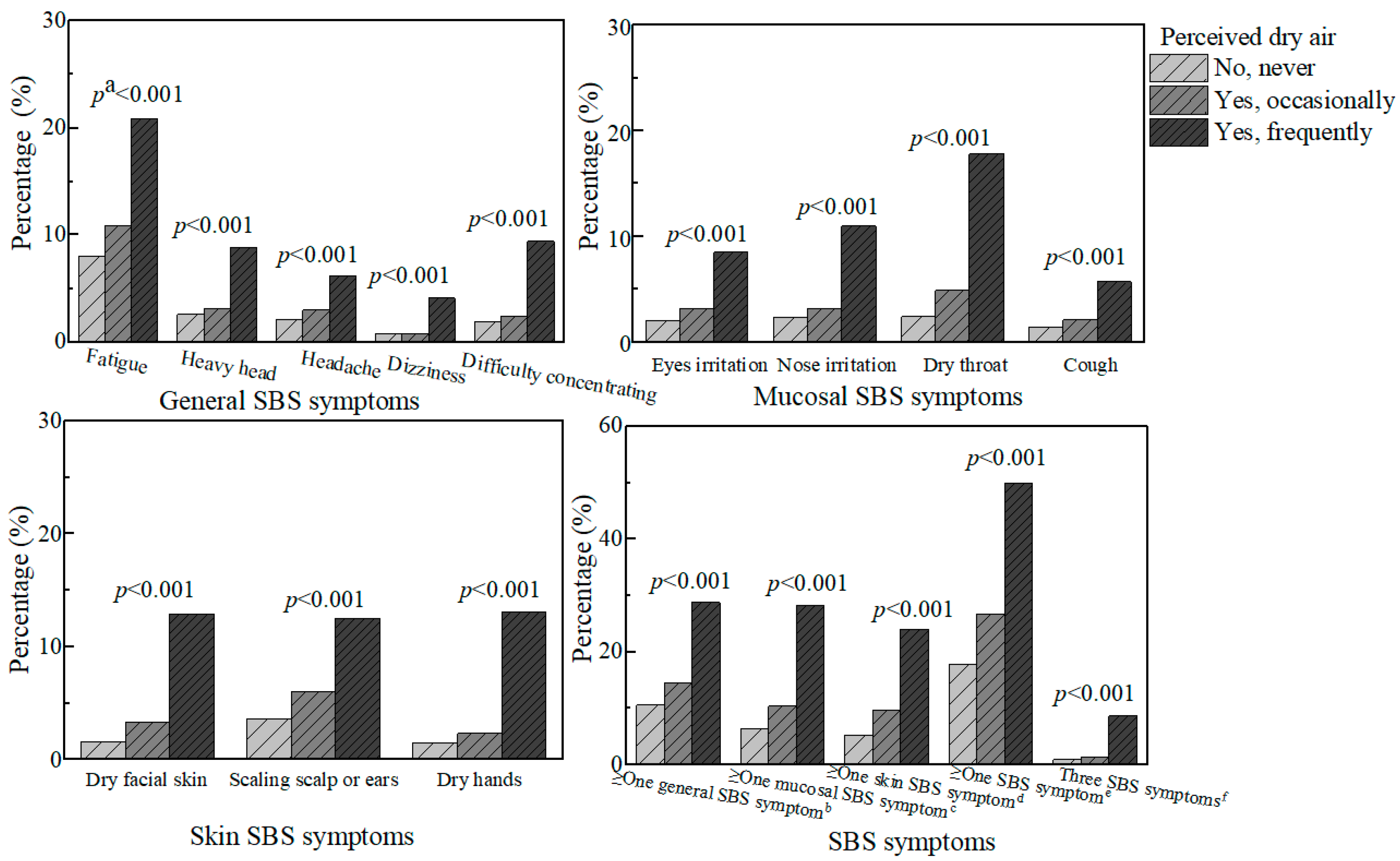 p < 0.05). The associations between perceived dry air and parents’ SBS symptoms are shown in