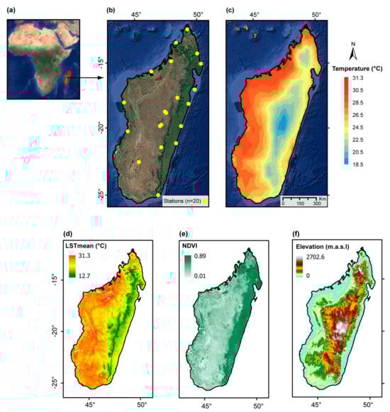 Location of Madagascar (a) and the meteorological stations considered (n = 20) (b), along with the annual daily average of CHIRTS Tmean (c), MODIS LSTmean and NDVI (d,e), and SRTM elevation (f).