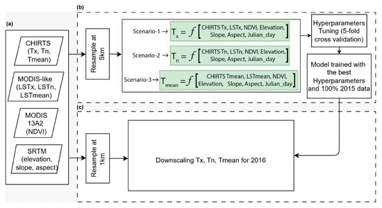 Flowchart of the air temperature downscaling method showing (a) the considered predictors along with (b) the models’ calibration at 5 km, and (c) the models’ application at 1 km.