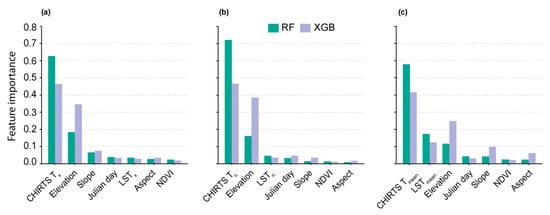 Logically, CHIRTS data (Tx, Tn, and Tmean) were identified as the most contributive variable, with FI values systematically superior to 40% and 50% for both the RF and XGB models. Due to the strong relationship linking air temperature and elevation, elevation was identified as the second most contributive variable in the XGB model across all scenarios (Tx, Tn, and Tmean), whereas it was only the case in scenario-1 and -2 (Tx and Tn) for the RF model. Interestingly, with a FI value superior to 10%, LST contribution was only significant for scenario-3 (Tmean), whereas FI values lower than 10% were observed for scenario-1 and -2 (Tx and Tn). This discrepancy can be explained by the LSTx and LSTn time acquisition, which differ from the observed local time of Tx and Tn, respectively; a temporal mismatch that is attenuated through the average process to derive LSTmean. NDVI low FI scores (<5%) can be explained by the time lag between air temperature and the NDVI temporal dynamic. While air temperature presents high variations from day to day, the NDVI changes are much smoother. Therefore, no relation is expected between air temperature and NDVI at the daily time step. Similar observations apply to Julian day. However, NDVI and Julian day gathered relevant information on Madagascar’s temporal seasonality and bioclimatic regions to adjust the models in space and time.