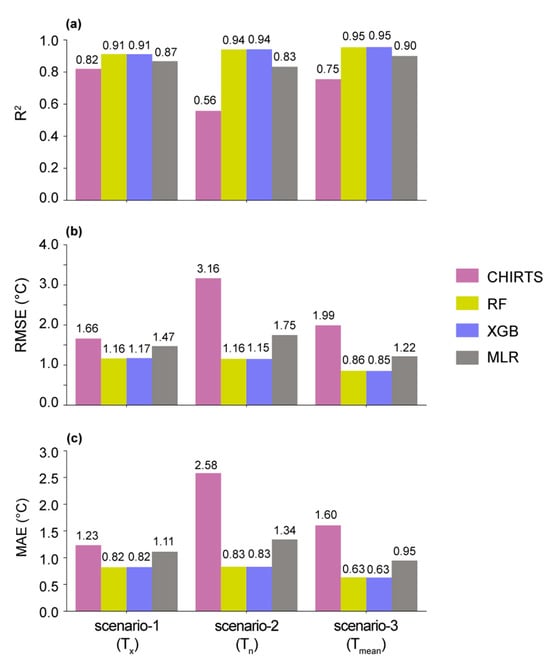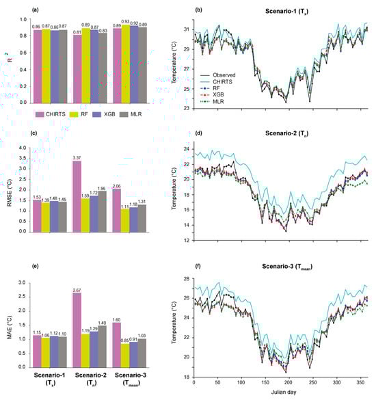 In scenario-2 (Tn), slight improvements of 9%, 7%, and 2% are observed for the R2 value and RF, XGB, and MLR models, respectively, in comparison to CHIRTS. The largest improvements are observed in RMSE (MAE), with a decrease of 53% (55%), 49% (52%), and 42% (44%) for RF, XGB, and MLR, respectively, in comparison to CHIRTS.
