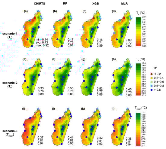 R2 obtained at the meteorological stations location for the validation of 2016 data at 1 km spatial resolution for all the considered models (RF, XGB, MLR) and CHIRTS for scenarios-1 (a–d), -2 (e–h), and -3 (i–l). The color maps used as background show the daily mean air temperature average (Tn, Tx, and Tmean) observed for 2016. White pixels are observed due to LST and/or NDVI missing data, preventing the models’ application.