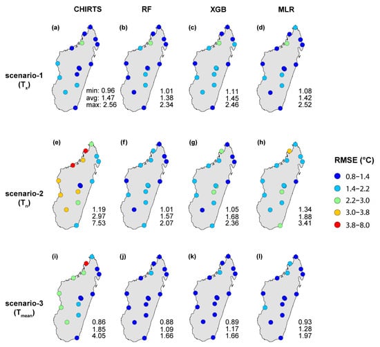 RMSE obtained at the meteorological stations location for the validation on 2016 data at 1 km spatial resolution for all the considered models (RF, XGB, MLR) and CHIRTS for scenarios-1 (a–d), -2 (e–h), and -3 (i–l).