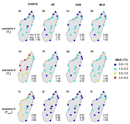 MAE obtained at the meteorological stations location for the validation on 2016 data at 1 km spatial resolution for all the considered models (RF, XGB, MLR) and CHIRTS for scenarios-1 (a–d), -2 (e–h), and -3 (i–l).