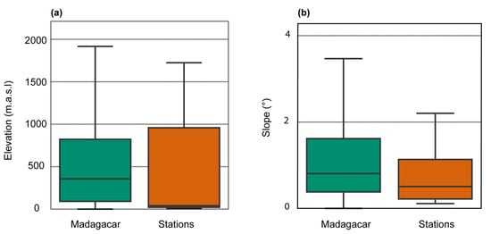 Boxplot comparison of (a) elevation, and (b) slope observed at the national scale and at the meteorological station locations. The bottom and upper edges of the boxes represent the 25th and 75th percentile values, respectively, whereas the central horizontal line represents the median value.