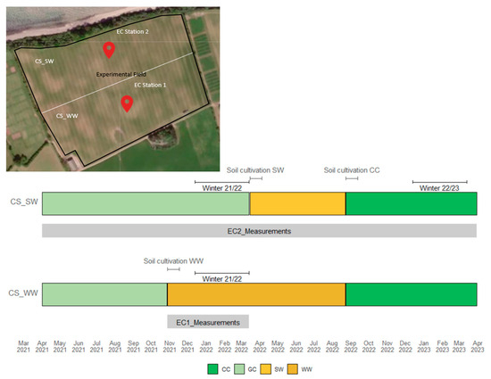 Experimental site setup and crop sequence. The top part shows a Landsat image of the experimental field (indicated by the black line), with the eddy covariance (EC) stations 1 and 2 marked by the respective markers (Source: Google Earth). The white line indicates the boundary between the parts cultivated with the spring wheat crop sequence (CS_SW) and the winter wheat crop sequence (CS_WW). The timeline below illustrates the two crop sequences, including grass-clover (GC), spring wheat (SW), and the cover crop (CC) or winter wheat (WW), respectively. Grey bars indicate the length of the respective EC measurements, and the dark grey and black brackets indicate the soil cultivation and winter periods.