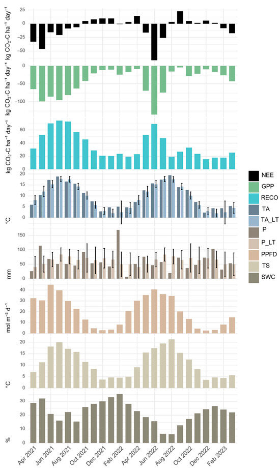 The monthly average of daily sums of carbon dynamics and abiotic factors. Net ecosystem exchange (NEE), gross primary production (GPP) and ecosystem respiration (RECO) as well as the monthly averages of the abiotic variables photosynthetic photon flux density (PPFD) (given as the average daily sum) soil temperature (TS), soil water content (SWC) (both at the 5 cm depth), air temperature (TA) and the corresponding long-term (LT) mean (1991–2020) (TA_LT) are given in monthly averages. The monthly precipitation (P) with the corresponding long-term (LT) mean (1991–2020) (P_LT) is given as a cumulative value. The error bars indicate the standard deviation of the long-term precipitation and air temperature values.