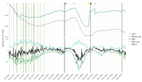 Net ecosystem exchange, GPP, and RECO followed a clear seasonal pattern, illustrated in Figure 2 and Figure 3. The NEE was predominantly negative during the growing season, indicating net CO2 uptake, and positive during the dormant season, reflecting CO2 release to the atmosphere. These dynamics were strongly shaped by site management practices.