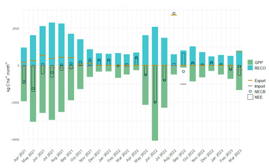 Carbon imports and exports at the field-scale during the study period are summarized in Table 5. Imports and exports varied significantly between months and years. The month with the highest export of C was August 2022 due to the harvest of SW. In September 2022, the highest import due to slurry application was recorded (see Figure 4). During the GC period, total C imported amounted to −606 kg C ha−1, originating exclusively from excreta deposited by grazing dairy cows. Exports totaled 2382 kg C ha−1, consisting of pasture intake during grazing events and the silage cut. The SW period recorded the lowest imports (−55.4 kg C ha−1, from seed sown), while exports were highest with 1532 kg C ha−1 removed as wheat grain and 1197 kg C ha−1 as straw. The CC period was the only phase where imports (−1258 kg C ha−1) exceeded exports (736 kg C ha−1).