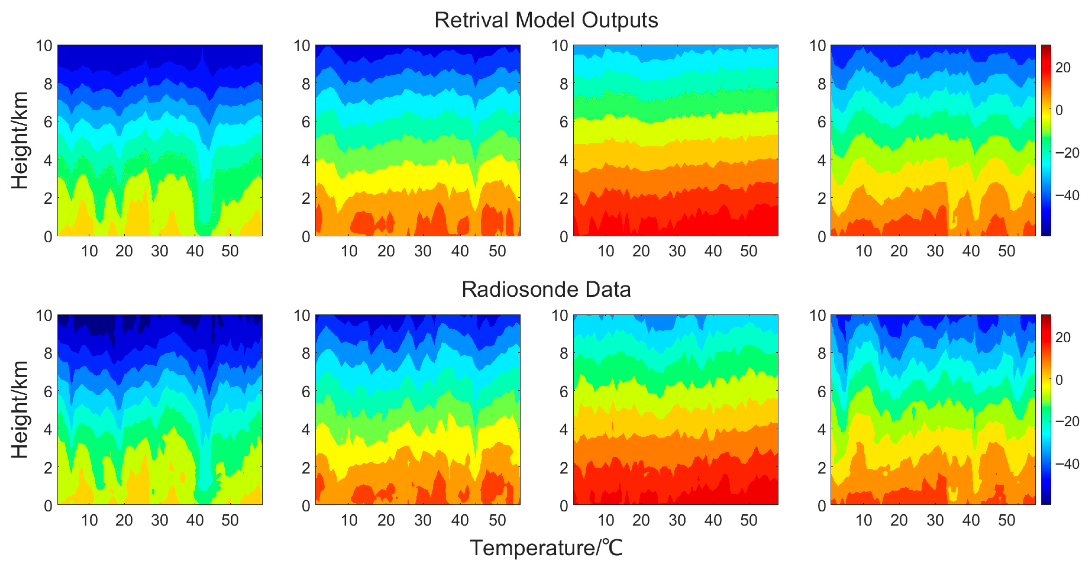 - The retrieval performance of different meteorological variables exhibits seasonal variations. The retrieval accuracy of temperature profiles is highest in summer and lowest in spring. The relative humidity profile also performs best in summer and worst in winter. However, the retrieval accuracy of water vapor density profiles and IWV is best in winter and worst in summer. This is due to enhanced radiation scattering by large water droplets in the summer atmosphere, which introduces measurement errors in brightness temperature. Additionally, large variations in the humidity field complicate the retrieval process. In winter and spring, low-level inversions are more prominent, with substantial variations in the thickness and intensity of the inversion layer, making it challenging to retrieve refined temperature profiles.
