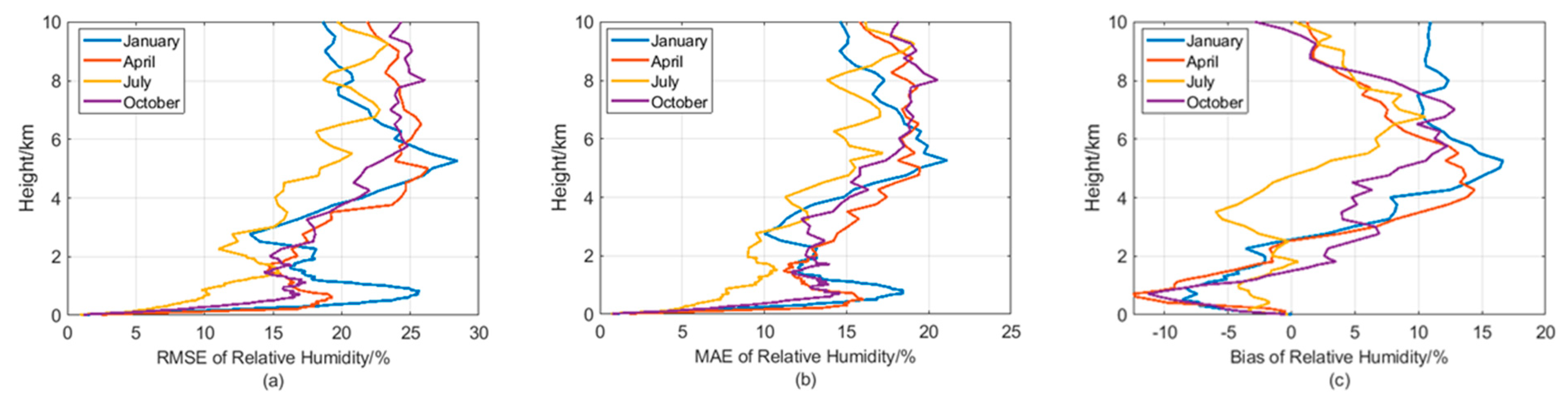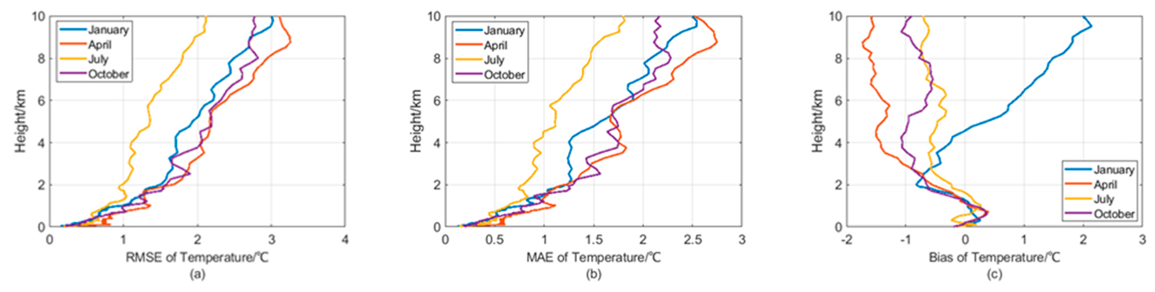 - Seasonal assessment: For each independent month model (January, April, July, and October represent winter, spring, summer, and autumn), the error of the entire elevation layer from 0 to 10,000 m of all time periods in each month is statistically analyzed to quantify the seasonal variation characteristics.