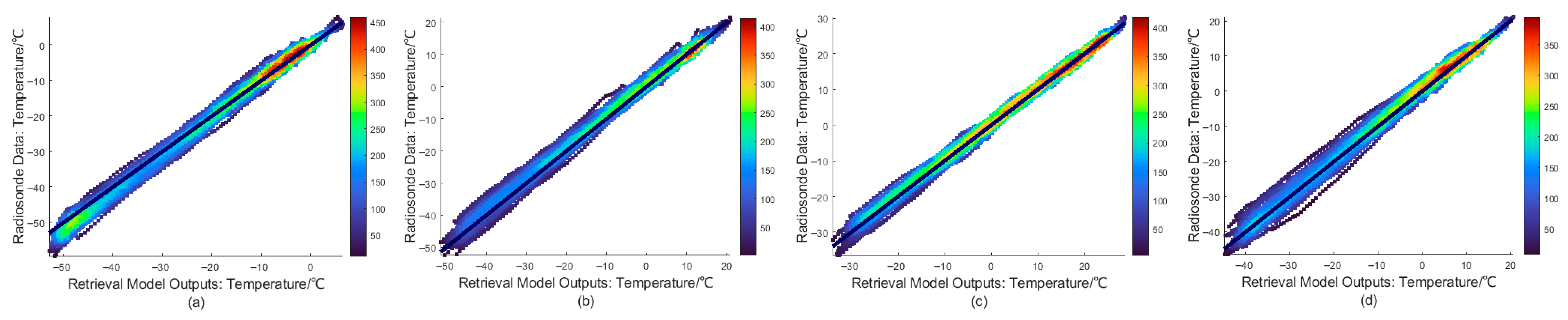 - Liu, Y.Y.; Mao, J.T.; Liu, J.; Li, F. Research of BP neural network for microwave radiometer remote sensing retrieval of temperature, relative humidity, cloud liquid water profiles. Plateau Meteorol. 2010, 29, 1514–1523. (In Chinese) [Google Scholar]