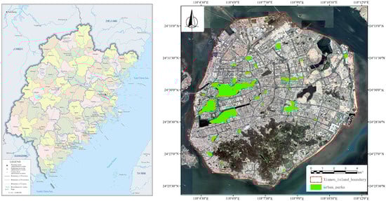 Xiamen is located between 24°23′–24°54′ N and 117°53′–118°26′ E (Figure 1) and is designated as a Special Economic Zone in China. The city has reached an urbanization rate of 89.41%. This study focuses on Xiamen Island, the core urban area of Xiamen, which is surrounded by the sea on all sides, with a total area of 158 km2 and a population of approximately 1.28 million. In 2023, Xiamen’s gross domestic product (GDP) reached 806.649 billion yuan, ranking it among China’s new first-tier cities. However, the rapid pace of urbanization has brought increasing challenges to the island’s ecological stability, such as climate change and environmental pollution, which have adversely affected the well-being of its residents [].