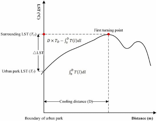 Previous studies have demonstrated that the cold island effect of urban parks diminishes with increasing distance from the park boundary and eventually becomes negligible. This attenuation process typically exhibits several key inflection points, which form the basis for four critical indicators of cooling performance: park cooling area (PCA), park cooling intensity (PCI), park cooling gradient (PCG) and park cooling efficiency (PCE) [].
