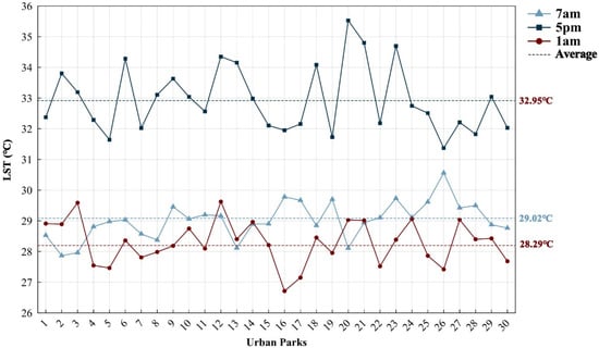 As shown in Table 3 and Figure 3, the mean LST at 5:00 p.m. (32.95 °C) was significantly higher than at the other two time points. The mean LST at 7:00 a.m. (29.02 °C) was slightly higher than that at 1:00 a.m. (28.29 °C), with both values relatively close. Regarding variability, the standard deviation of LST at 5:00 p.m. was notably larger, indicating greater spatial dispersion of park surface temperatures during the afternoon.