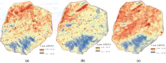 Diurnal spatial distribution of LST in (a) 7 a.m., (b) 5 p.m., (c) 1 a.m.