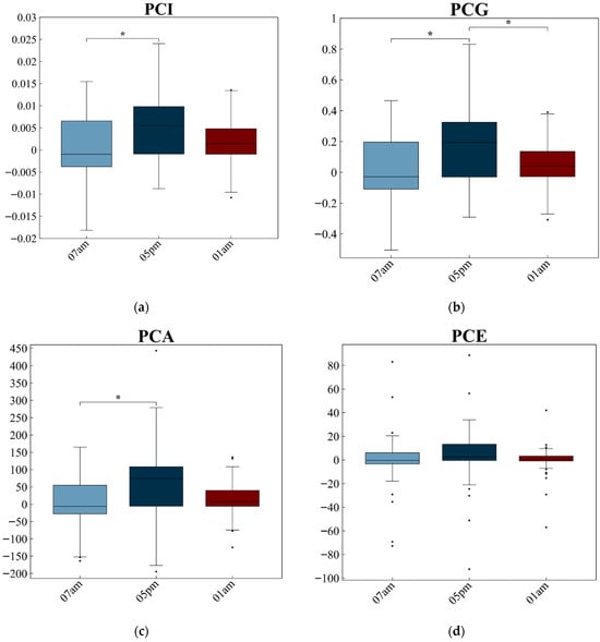 Diurnal variations in the (a) park cooling intensity (PCI), (b) park cooling gradient (PCG), (c) park cooling area (PCA), (d) park cooling efficiency (PCE). Note: The * indicating a significant difference in intergroup variance.