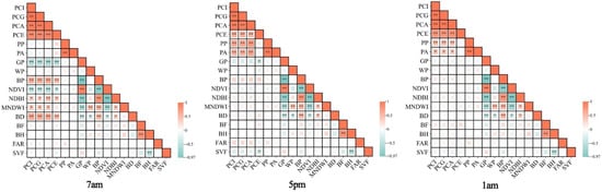 Figure 6 illustrates the varying associations between 2D/3D spatial morphological factors and PCIE at different times of the day. Specifically, at 7:00 a.m., significant correlations were observed between the four cooling indicators and several 2D factors, including GP, BP, NDVI and NDBI. In addition, the 3D factor of BD also showed similar correlations. Moreover, PCI, PCG and PCA at this time were also associated with MNDWI. At 5:00 p.m. and 1:00 a.m., similar morphological factors were correlated with PCI, PCG and PCA, particularly PP and PA, suggesting that intrinsic characteristics of the parks themselves play a key role in determining cooling performance during these periods. Notably, at 5:00 p.m., PCE was found to be associated with both GP and SVF, indicating a combined influence of both 2D and 3D morphological factors on cooling efficiency during the afternoon period.