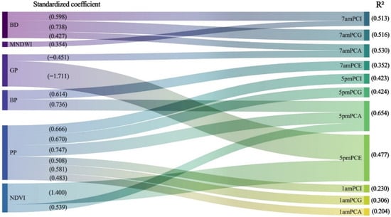 Figure 7 reveals both similarities and differences in the factors influencing PCIE across different time periods. Specifically, at 7:00 a.m., BD exhibited a strong and positive impact on PCI, PCG and PCA, suggesting that this 3D morphological factor is particularly critical for enhancing morning cooling performance. Additionally, MNDWI also contributed positively to PCI at this time. In contrast, GP was found to negatively affect PCA, indicating a suppressive effect. BP was the sole significant predictor of PCE at 7:00 a.m., with a positive effect, highlighting the importance of construction-related factors in improving cooling efficiency during the early morning. Excluding PCE, PP emerged as the primary predictor of PCI, PCG, and PCA at both 5:00 p.m. and 1:00 a.m., showing a consistent positive effect. This underscores the importance of intrinsic park characteristics in enhancing the cold island effect during the afternoon and nighttime periods. At 5:00 p.m., PCA was also positively influenced by BP and NDVI, indicating the additional contribution of built-up intensity and vegetation coverage to cooling performance. Regarding PCE at 5:00 p.m., both GP and NDVI were identified as key influencing factors; however, they exhibited opposite effects. While NDVI enhanced cooling efficiency, an increase in GP was associated with a reduction in efficiency. This suggests that factors in the park buffer zone also play a critical role and deserve further attention.