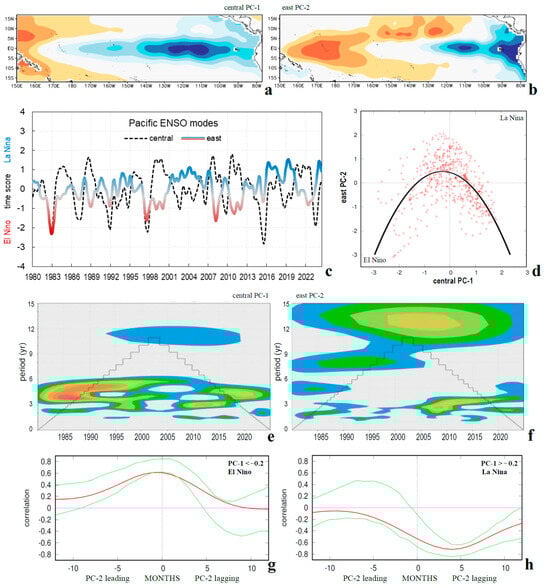 EOF decomposition: (a,b) spatial loading pattern of PC-1 and PC-2 with + sign convention whereby cool–east, (c) filtered time scores, (d) scatterplot of time scores with parabolic fit, and (e,f) time score wavelet spectra, where the shaded areas indicate > 95% confidence. Lag-correlation of PC-1 and PC-2 time scores segregated by central PC-1 into (g) El Niño and (h) La Niña. All cover the period 1980–2024.