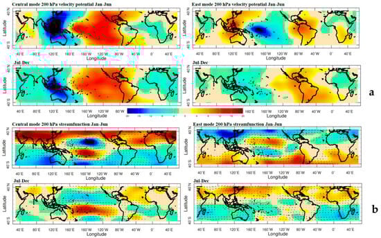(a) Composite 200 hPa velocity potential anomalies for central ENSO seasons, 84,85,88,89,99,00,08,11,21,22 (left), and east mode ENSO, 94,03,04,05,07,16,17,19,20,24, in Jan–Jun (1st and 3rd row) and Jul–Dec (2nd and 4th row). (b) Composite 200 hPa streamfunction and wind vector anomalies; the largest anomaly = 3 m/s. Upper divergence is indicated by negative blue shading in (a); upper rotation is identified in (b); units ×105 m2/s.