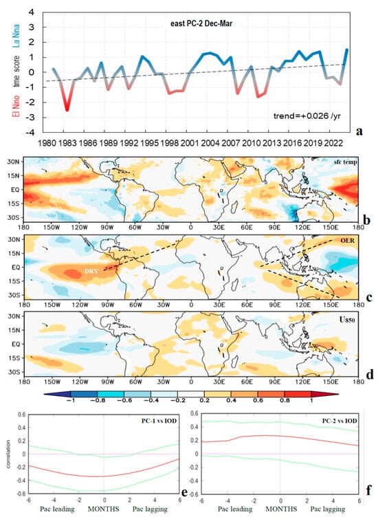 EOF decomposition: (a) PC-2 Dec–Mar time score and linear trend. Correlation of Dec–Mar PC-2 time score with (b) surface temperature, (c) OLR, and (d) U850 wind during 1980–2024. Lag-correlation of (e) PC-1 and (f) PC-2 time scores with Indian Ocean Dipole (sea temperatures); green lines are upper and lower quintiles. Dashed lines in (c) refer to standing atmospheric Rossby waves. Appendix A Figure A1 shows equivalent PC-1 correlation maps.